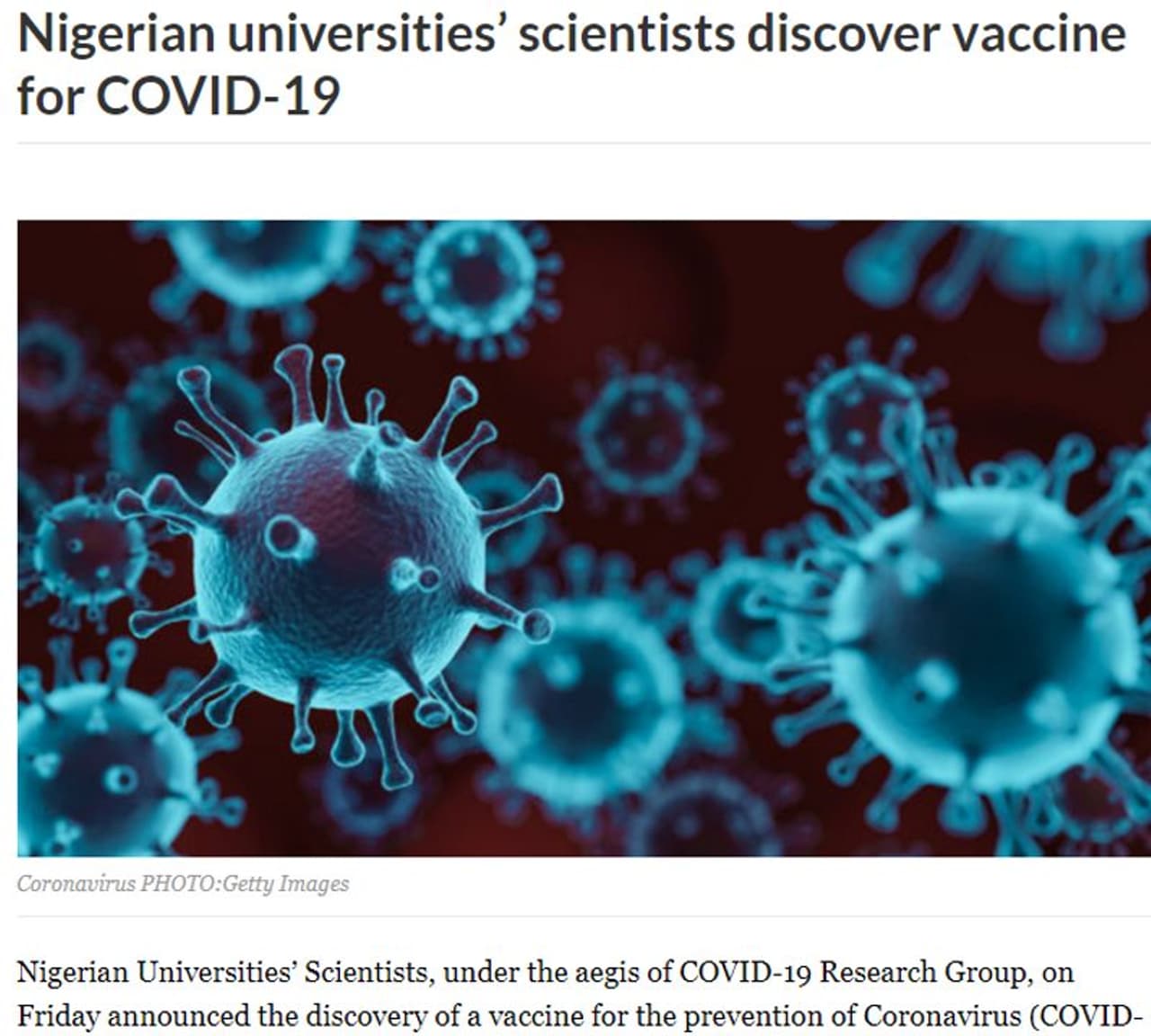 നൈജീരിയന് സര്വകലാശാല കൊവിഡ് വാക്സിന് വികസിപ്പിച്ചു എന്ന തലക്കെട്ടിലായിരുന്നു വാര്ത്തകള്. 'ദ് ഗാര്ഡിയന് നൈജീരിയ' അടക്കമുള്ള ആഫ്രിക്കന് മാധ്യമങ്ങളാണ് വാര്ത്ത പ്രസിദ്ധീകരിച്ചത്.