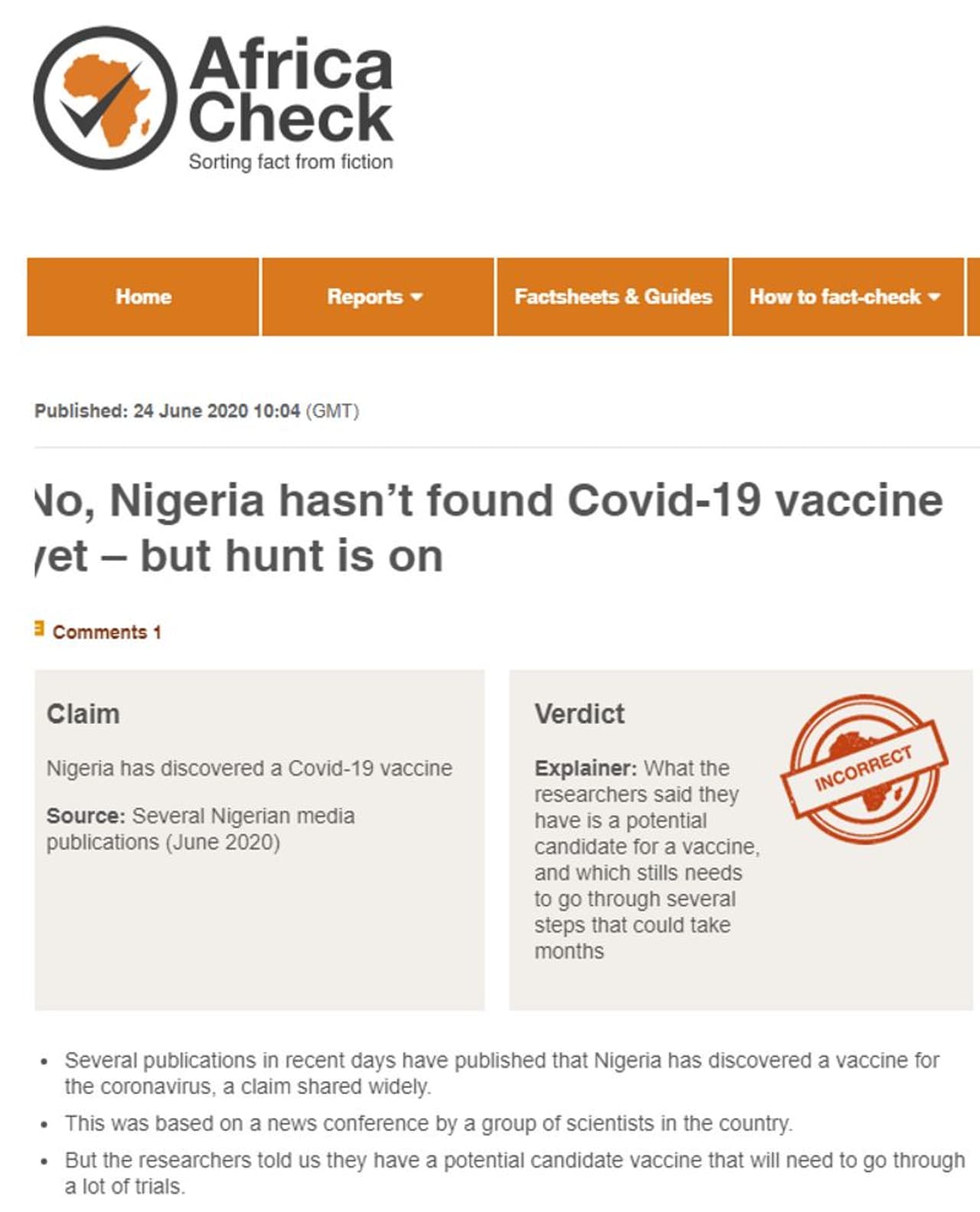 നൈജീരിയന് സര്വകലാശാലകള് ചേര്ന്ന് തദ്ദേശീയമായി വാക്സിന് വികസിപ്പിച്ചതായി വിവരമൊന്നും ലഭിച്ചിട്ടില്ലെന്ന് നൈജീരിയന് സെന്റര് ഫോര് ഡിസീസ് കണ്ട്രോള്, ആഫ്രിക്ക ചെക്കിനോട് വ്യക്തമാക്കി. ശാസ്ത്രീയ കണ്ടെത്തലുകള് ജേണലുകളിലൂടെയോ പ്രസിദ്ധീകരണങ്ങളിലൂടെയോ അറിയിക്കുന്നതാണ് നല്ലത് എന്നും സാധുതയില്ലാത്ത പ്രസ് മീറ്റുകള് ഉചിതമല്ലെന്നും അവര് പറഞ്ഞു.