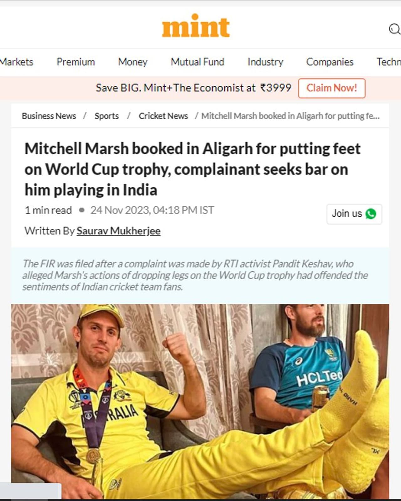 ഏകദിന ലോകകപ്പ് ട്രോഫിക്ക് മുകളില് കാല് വച്ചതിന് ഉത്തര്പ്രദേശിലെ അലിഗഢില് മിച്ചല് മാര്ഷിനെതിരെ എഫ്ഐആര് രജിസ്റ്റര് ചെയ്തതായി വിവിധ മാധ്യമങ്ങളാണ് വാര്ത്ത റിപ്പോര്ട്ട് ചെയ്തത്. ഫ്രീപ്രസ് ജേണലും, മിന്റും, ഒപ്ഇന്ത്യയും ഈ വാര്ത്ത നല്കിയ വെബ്സൈറ്റുകളുടെ പട്ടികയിലുണ്ട്. ഇതേ വാര്ത്ത സാമൂഹ്യമാധ്യമമായ ട്വിറ്ററിലും കാണാം.