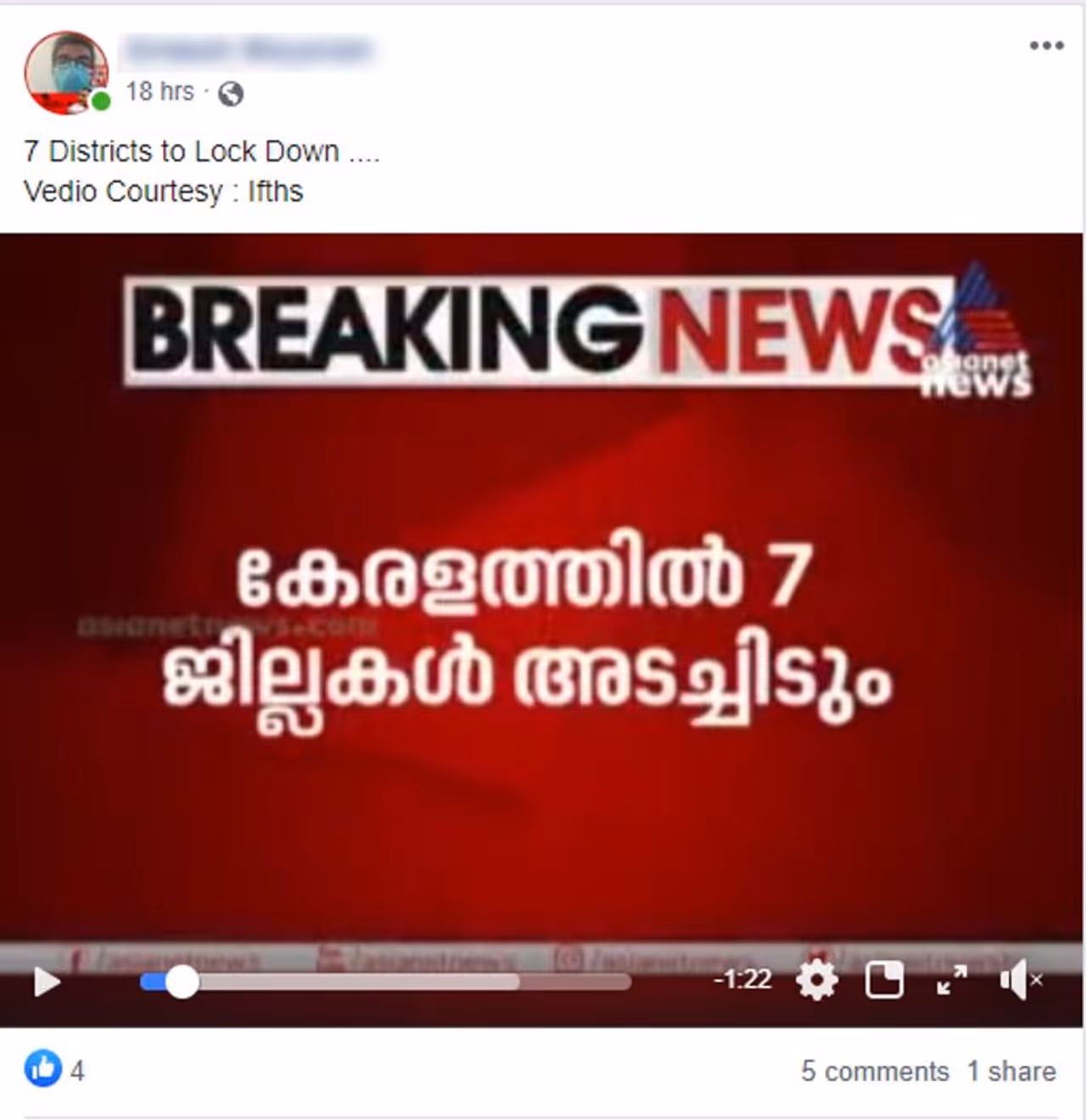 'കേരളത്തിൽ ഏഴ് ജില്ലകൾ സമ്പൂർണ ലോക്ക് ഡൗണിലേക്ക്. തിരുവനന്തപുരം, എറണാകുളം, പത്തനംതിട്ട, കാസർകോട്, മലപ്പുറം, കണ്ണൂർ, കോട്ടയം ജില്ലകളിലാണ് നിയന്ത്രണം വരുന്നത്' എന്നാണ് ഇപ്പോഴത്തെ പ്രചാരണം. വാട്സ്ആപ്പിലും ഫേസ്ബുക്കിലും പ്രചരിക്കുന്ന വീഡിയോയുടെ പകര്പ്പ് ഏഷ്യാനെറ്റ് ന്യൂസ് ഓണ്ലൈന് ഫാക്ട് ചെക്ക് വിഭാഗത്തിന് ലഭിച്ചു. അവയുടെ സ്ക്രീന്ഷോട്ടുകള് ചുവടെ ചേര്ത്തിരിക്കുന്നു.