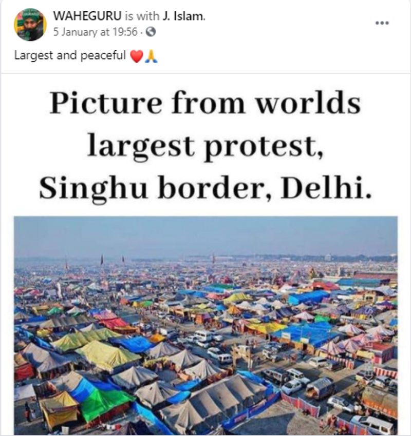 തുറസ്സായസ്ഥലത്തുള്ള നൂറുകണക്കിന് ടെന്റുകളുടെ ആകാശചിത്രമാണ് സാമൂഹ്യമാധ്യമങ്ങളില് പ്രചരിക്കുന്നത്. 'സിംഗു അതിര്ത്തിയില് നടക്കുന്ന ലോകത്തിലെ ഏറ്റവും വലിയ പ്രതിഷേധം' എന്ന തലക്കെട്ടും കാണാം.