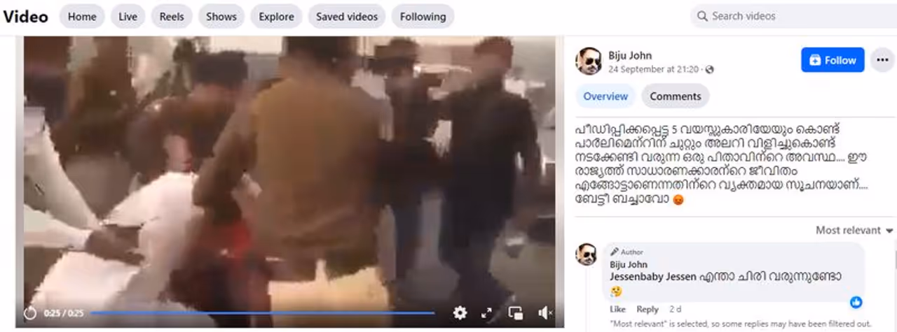 ഫേസ്ബുക്കില് സെപ്റ്റംബര് 24-ാം തിയതി ബിജു ജോണ് എന്നയാളാണ് മലയാളം കുറിപ്പോടെ വീഡിയോ ഷെയര് ചെയ്തിരിക്കുന്നത്. ഈ വാര്ത്ത പ്രസിദ്ധീകരിക്കുമ്പോള് ഒന്നരലക്ഷത്തോളം പേര് ഈ വീഡിയോ കണ്ടുകഴിഞ്ഞു. ഒരാള് പെണ്കുട്ടിയെ എടുത്തുകൊണ്ട് നിലവിളിച്ച് പ്രതിഷേധിക്കുന്നതും സെക്യൂരിറ്റി ഉദ്യോഗസ്ഥന് എത്തി അവരെ പിടികൂടുന്നതുമാണ് വീഡിയോയില്. ദൃശ്യത്തിനൊപ്പമുള്ള കുറിപ്പില് ബിജു ജോണ് ഇങ്ങനെ എഴുതിയിരിക്കുന്നു. 'പീഡിപ്പിക്കപ്പെട്ട 5 വയസുകാരിയേയും കൊണ്ട് പാർലമെന്റിന് ചുറ്റും അലറി വിളിച്ചുകൊണ്ട് നടക്കേണ്ടി വരുന്ന ഒരു പിതാവിന്റെ അവസ്ഥ... ഈ രാജ്യത്ത് സാധാരണക്കാരന്റെ ജീവിതം എങ്ങോട്ടാണെന്നതിന്റെ വ്യക്തമായ സൂചനയാണ്... ബേട്ടീ ബച്ചാവോ'.