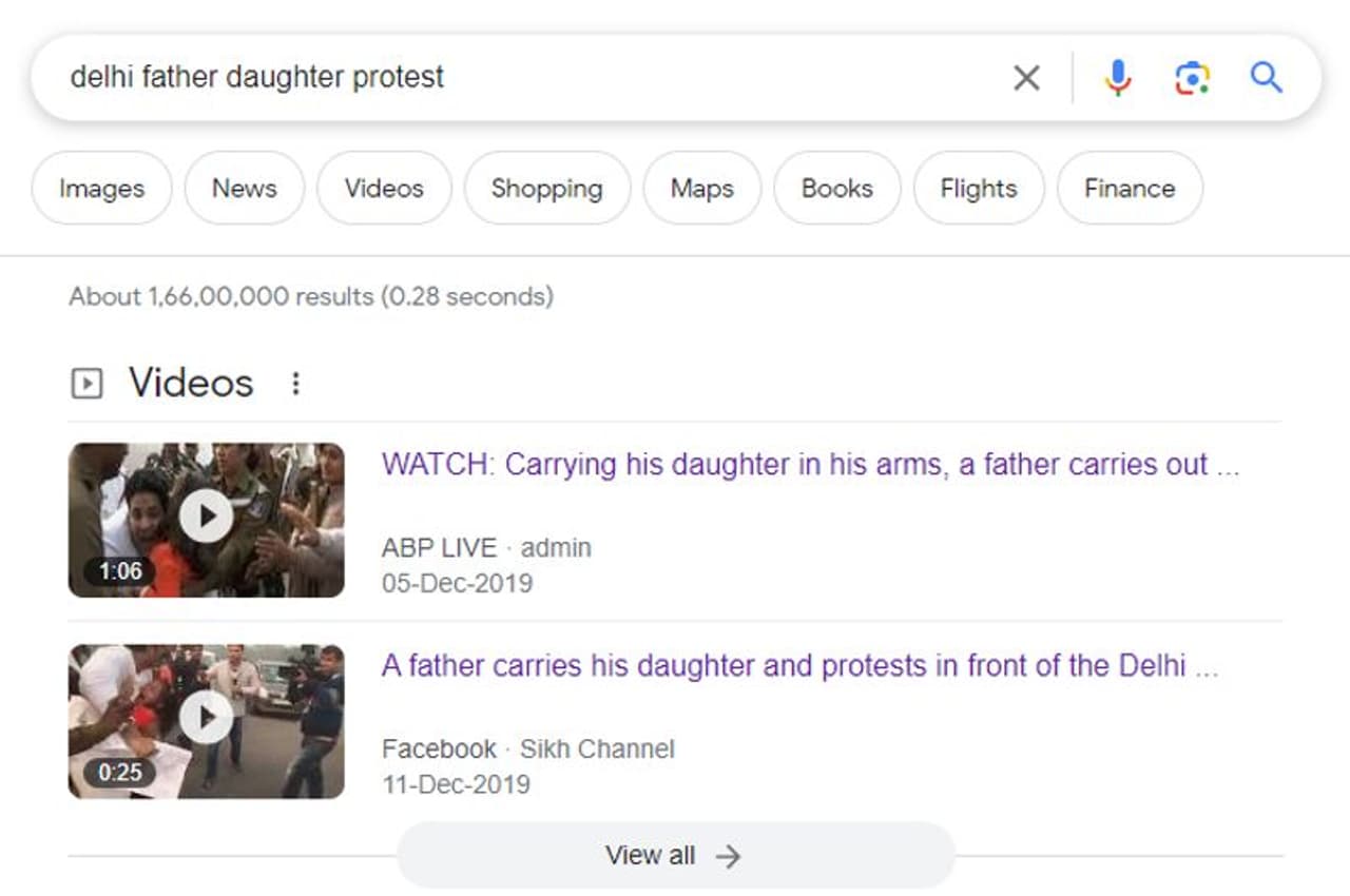 വീഡിയോ ദില്ലിയില് നിന്നാണ് എന്ന് വ്യക്തമായതോടെ 'delhi father daughter protest' എന്ന കീവേഡ് ഉപയോഗിച്ച് ഗൂഗിളില് സെര്ച്ച് ചെയ്തു. 2019 ഡിസംബര് 5ന് എബിപി ലൈവ് പ്രസിദ്ധീകരിച്ച വാര്ത്തയാണ് ആദ്യ സെര്ച്ച് റിസല്റ്റായി ലഭിച്ചത്.