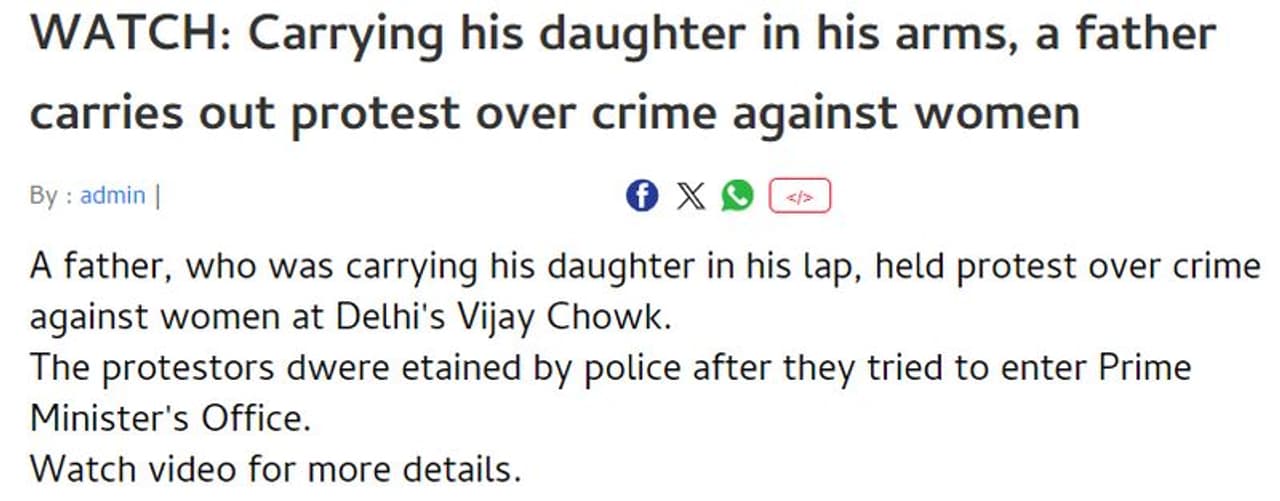 ദില്ലി: രാജ്യതലസ്ഥാനമായ ദില്ലി വലിയ പ്രതിഷേധങ്ങളുടെ വേദി കൂടിയാണ്. ദില്ലിയില് പാര്ലമെന്റ് പരിസരത്ത് പെണ്കുഞ്ഞിനെ കൈയിലേന്തി പിതാവ് അലറിവിളിച്ചുകൊണ്ട് പ്രതിഷേധിക്കുന്ന വീഡിയോ ഫേസ്ബുക്ക് ഉള്പ്പടെയുള്ള സാമൂഹ്യമാധ്യമങ്ങളില് ആളുകളെ കരയിക്കുകയാണ്. 'പീഡിപ്പിക്കപ്പെട്ട 5 വയസുകാരിയെയും കൊണ്ട് പാർലമെന്റിന് ചുറ്റും അലറി വിളിച്ചുകൊണ്ട് നടക്കേണ്ടി വരുന്ന ഒരു പിതാവിന്റെ അവസ്ഥയാണിത്' എന്ന കുറിപ്പോടെയാണ് വീഡിയോ ഷെയര് ചെയ്യപ്പെടുന്നത്. ഒറ്റത്തവണ പോലും കണ്ടുതീര്ക്കാന് പറ്റാത്തൊരു സങ്കടക്കാഴ്ചയായി ഈ ദൃശ്യങ്ങള് മാറുമ്പോള് കമന്റ് ബോക്സില് അവരോട് ചേര്ന്നുനില്ക്കുകയാണ് മനുഷ്യമനസുള്ള എല്ലാവരും. എന്നാല് പ്രചരിക്കപ്പെടുന്നതുപോലെയല്ല ഈ വീഡിയോയുടെ യാഥാര്ഥ്യം.