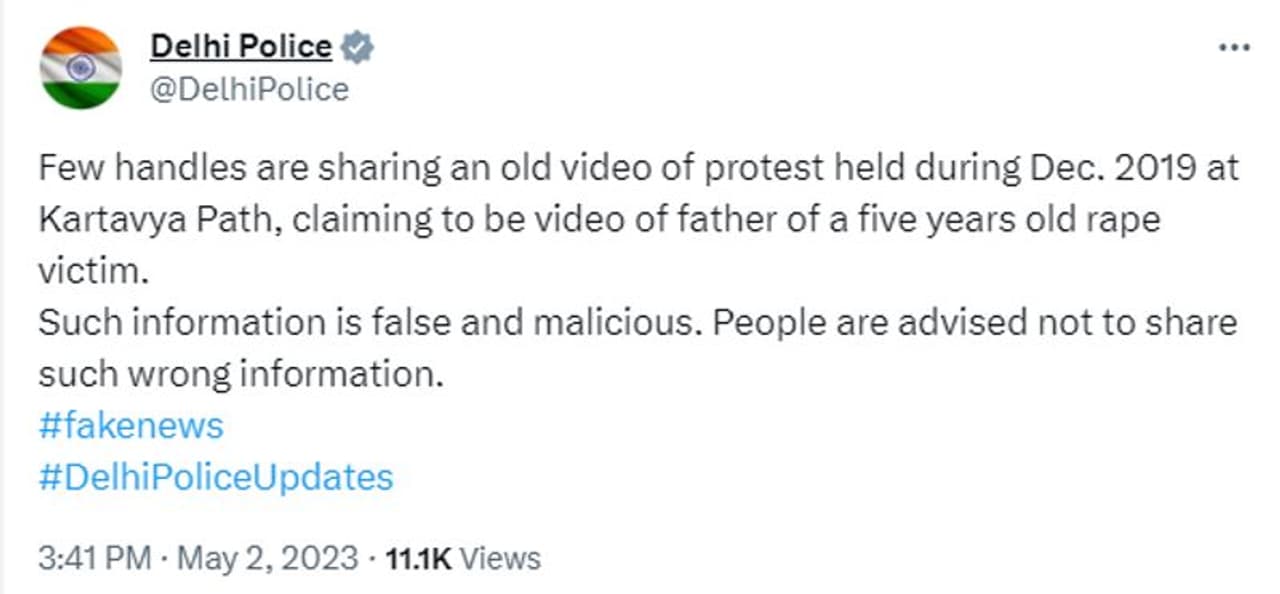 ഇതിലാണ്, ദില്ലി പൊലീസ് 2023 മെയ് രണ്ടിന് ചെയ്തിട്ടുള്ള ഒരു ട്വീറ്റ് കാണാനായത്. '2019 ഡിസംബറില് നടന്ന ഒരു പ്രതിഷേധത്തിന്റെ പഴയ വീഡിയോ ചിലര് ഇപ്പോള് ഷെയര് ചെയ്യുന്നത് ശ്രദ്ധയില്പ്പെട്ടിട്ടുണ്ട്. പീഡിപ്പിക്കപ്പെട്ട 5 വയസുകാരിയായ മകളെയും കൊണ്ട് പിതാവ് നടത്തുന്ന പ്രതിഷേധമാണിത് എന്ന് അവകാശപ്പെടുന്നു. എന്നാല് തെറ്റായ വിവരമാണിത്. വ്യാജ പ്രചാരണങ്ങള് നടത്തരുത്' എന്നും അപേക്ഷിച്ചുകൊണ്ടായിരുന്നു ദില്ലി പൊലീസിന്റെ ട്വീറ്റ്.