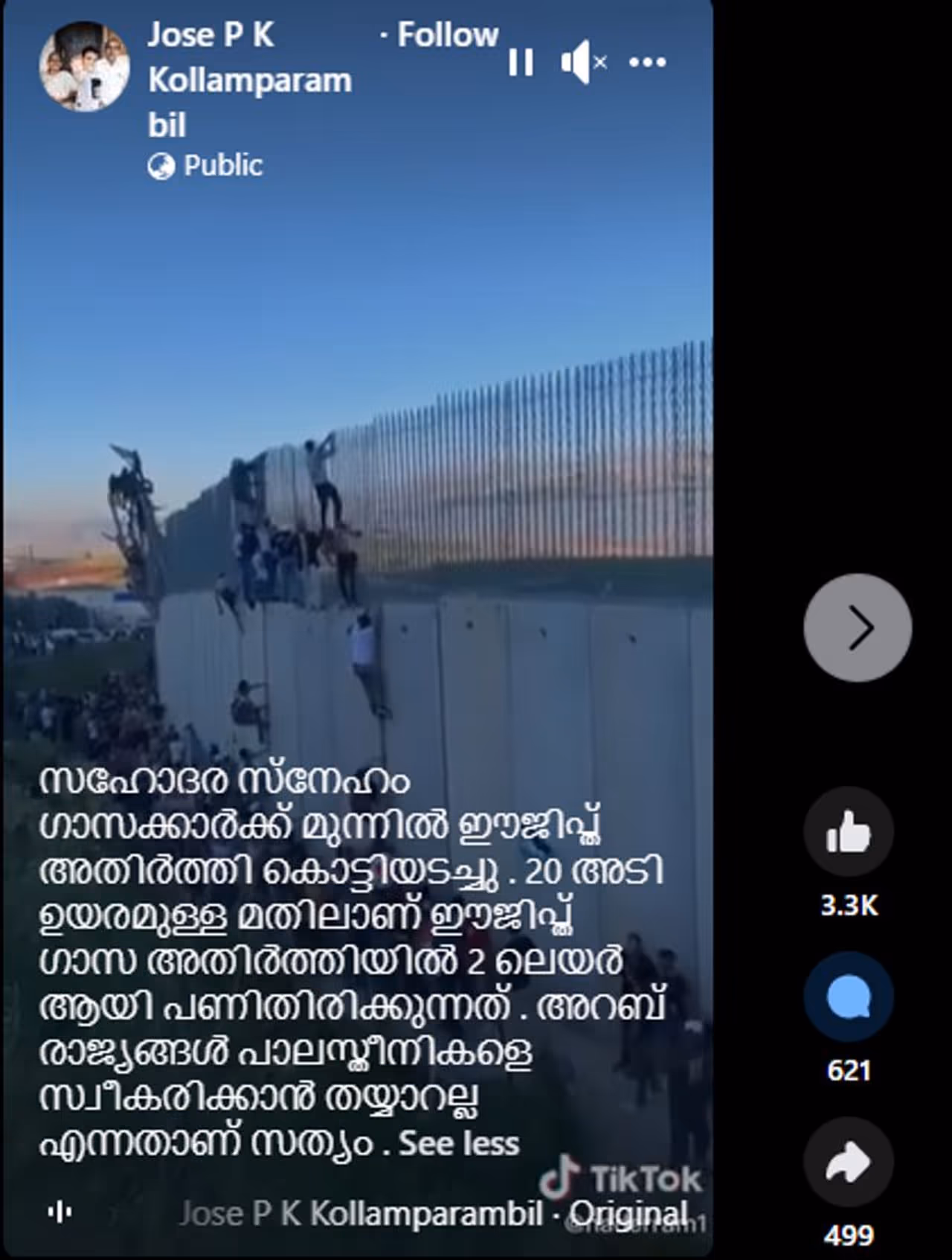 മീറ്ററുകള് ഉയരമുള്ള വലിയ മതില് നിരവധി പേര് ചാടിക്കടക്കാന് ശ്രമിക്കുന്നതാണ് ഫേസ്ബുക്കില് ജോസ് പി കെ കൊല്ലംപറമ്പില് എന്നയാള് പോസ്റ്റ് ചെയ്തിരിക്കുന്ന റീല്സ് വീഡിയോയില് കാണുന്നത്. മതില് ഭേദിക്കാന് ശ്രമിക്കുന്നവരില് ഭൂരിഭാഗവും യുവാക്കളാണ് എന്ന് വീഡിയോ കാണുമ്പോള് മനസിലാക്കാം. 'സഹോദര സ്നേഹം, ഗാസക്കാർക്ക് മുന്നിൽ ഈജിപ്ത് അതിർത്തി കൊട്ടിയടച്ചു. 20 അടി ഉയരമുള്ള മതിലാണ് ഈജിപ്ത് ഗാസ അതിർത്തിയിൽ 2 ലെയർ ആയി പണിതിരിക്കുന്നത്. അറബ് രാജ്യങ്ങൾ പലസ്തീനികളെ സ്വീകരിക്കാൻ തയ്യാറല്ല എന്നതാണ് സത്യം' എന്നുമാണ് ജോസ് പി കെ കൊല്ലംപറമ്പില് റീല്സിനൊപ്പം കുറിച്ചിരിക്കുന്നത്. ഈ വാര്ത്ത ചെയ്യുമ്പോഴേക്ക് 3300ലധികം ലൈക്കുകള് ഈ റീല്സിന് കിട്ടിക്കഴിഞ്ഞു.