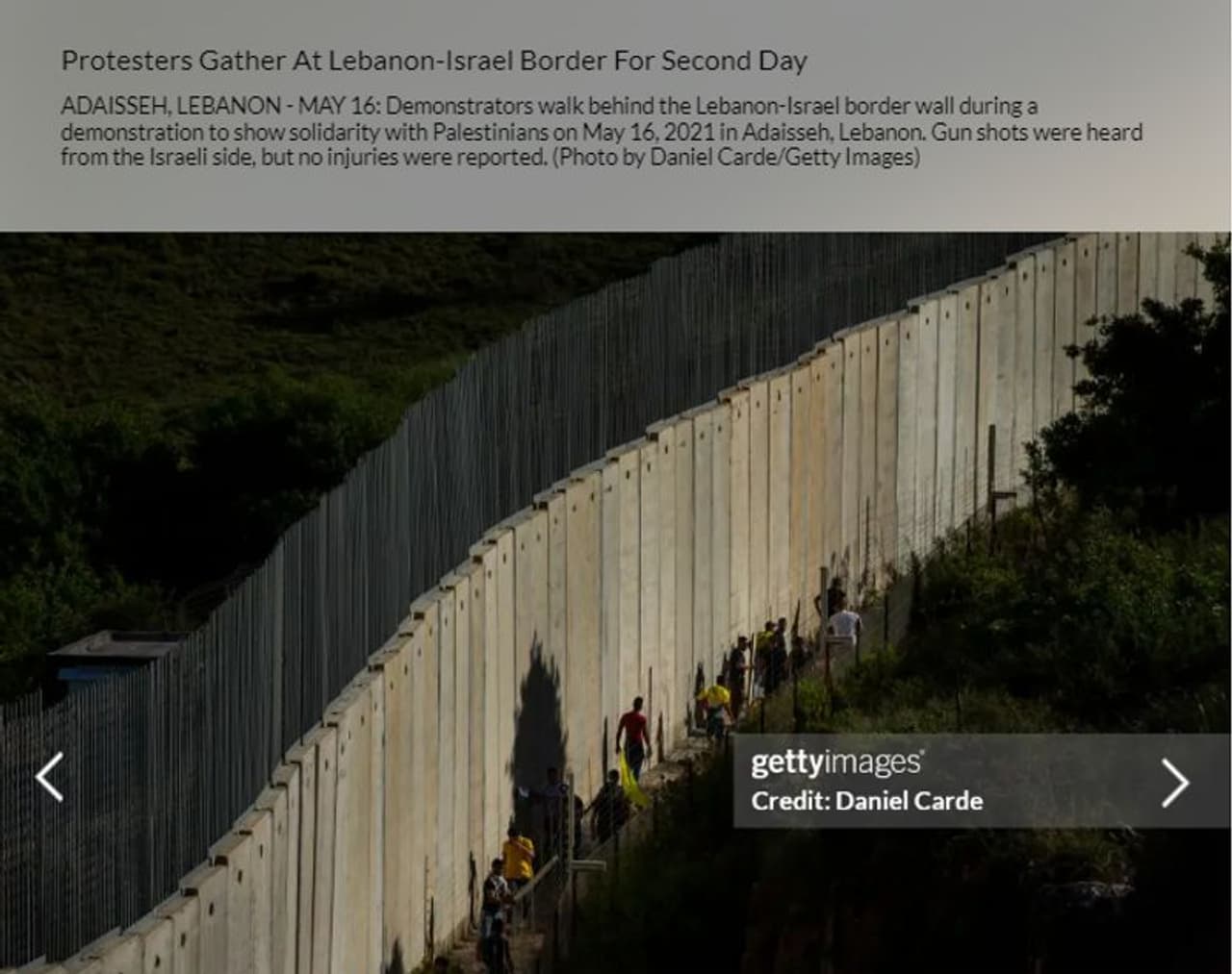 വീഡിയോ ലബനീസ്-ഇസ്രയേല് അതിര്ത്തിയില് നിന്നാണ് എന്നുറപ്പിക്കാന് കൂടുതല് പരിശോധനകള് നടത്തി. ഇതില് നിന്ന് ബോധ്യപ്പെട്ടത് ഈ വീഡിയോ സഹിതം 2021ല് വിവിധ മാധ്യമങ്ങള് വാര്ത്ത നല്കിയിരുന്നു എന്നാണ്. 2021ല് ഫോട്ടോ ഏജന്സിയായ ഗെറ്റിക്കായി ഡാനിയേല് കാര്ഡി നിരവധി ചിത്രങ്ങള് ലബനീസ്-ഇസ്രയേല് അതിര്ത്തിയില് നിന്ന് ഈ പ്രതിഷേധത്തിന്റെതായി പകര്ത്തിയിരുന്നതായി പരിശോധനയില് ബോധ്യമായി. ചിത്രങ്ങളിലൊന്ന് ചുവടെ നല്കുന്നു. 2021 മെയ് മാസത്തിലാണ് ഈ പ്രതിഷേധം ലബനീസ്-ഇസ്രയേല് അതിര്ത്തിയില് നടന്നത് എന്ന് ഫോട്ടോയുടെ വിവരണത്തില് ഗെറ്റി ഇമേജസ് നല്കിയിട്ടുണ്ട്. പ്രചരിക്കുന്ന വീഡിയോയില് കാണുന്ന അതേ മതിലാണ് ഈ ചിത്രത്തിലുമുള്ളത് എന്ന് ഒറ്റനോട്ടത്തില് വ്യക്തം.