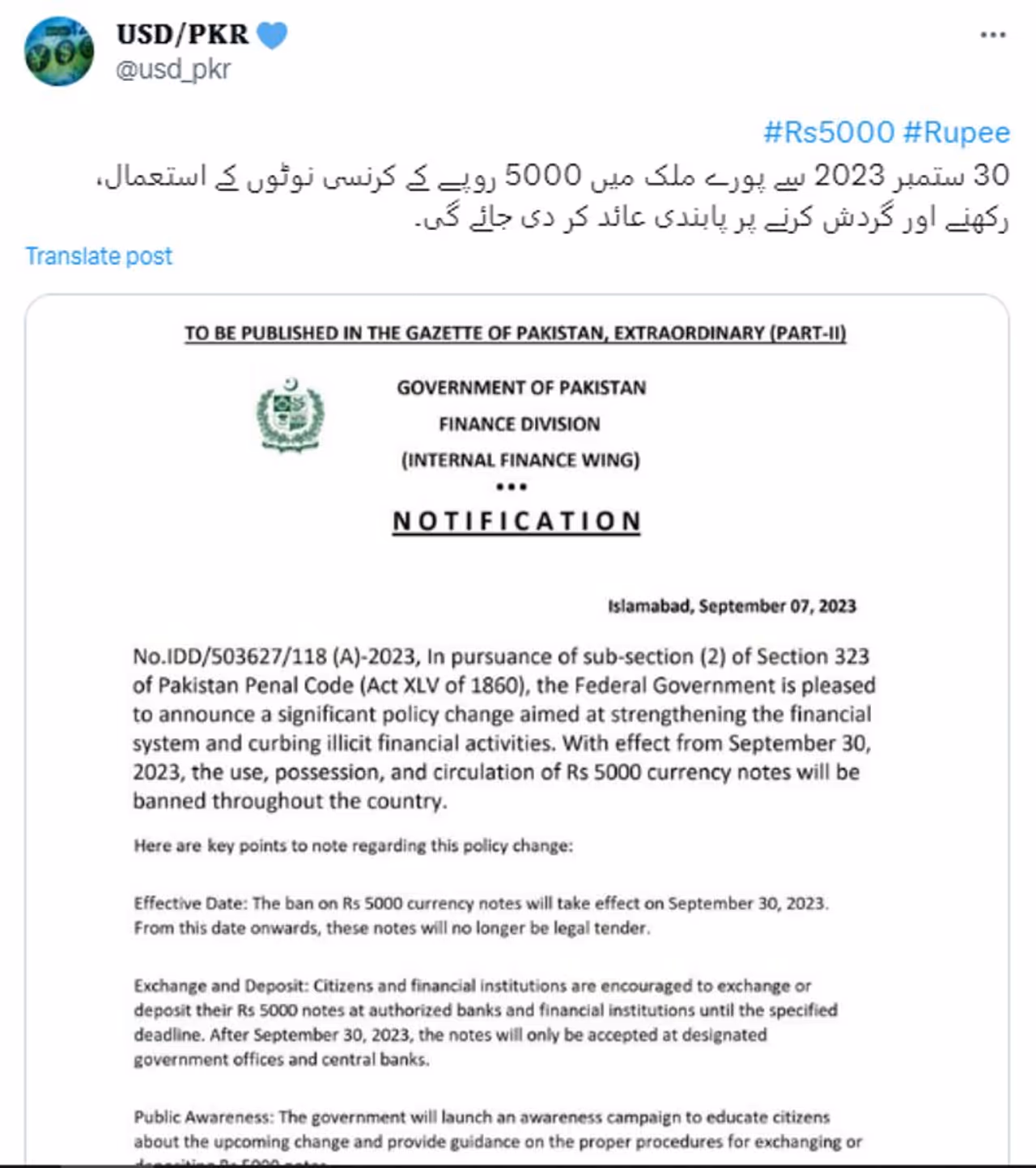 5000 രൂപ നോട്ടിന്റെ ഉപയോഗവും വിതരണവും നിരോധിച്ചുകൊണ്ട് പാകിസ്ഥാന് വിജ്ഞാപനമിറക്കി എന്ന് പറഞ്ഞുകൊണ്ടാണ് 𝐔𝐒𝐃/𝐏𝐊𝐑 എന്ന വെരിഫൈഡ് അക്കൗണ്ടില് നിന്ന് ട്വീറ്റ്. ഔദ്യോഗിക വിജ്ഞാപനത്തിന്റെ കോപ്പി എന്ന പേരിലൊരു ഓര്ഡറും ട്വീറ്റിനൊപ്പം കാണാം. 'സാമ്പത്തിക മേഖലയെ ശക്തിപ്പെടുത്തുന്നതിന്റെ ഭാഗമായാണ് നോട്ട് നിരോധനം, 5000 രൂപയുടെ നോട്ടുകള് ബാങ്കുകളും അംഗീകൃത സാമ്പത്തിക സ്ഥാപനങ്ങളും വഴി അവസാന തിയതിക്ക് മുമ്പ് മാറ്റിയെടുക്കാം. നോട്ട് നിരോധിക്കുന്നത് സംബന്ധിച്ച് ജനങ്ങളില് അവബോധം സൃഷ്ടിക്കാന് ബോധവല്ക്കരണ പരിപാടികള് സര്ക്കാര് നടത്തും' എന്നും വിജ്ഞാനപനത്തില് പറയുന്നു. 60000ത്തോളം പേര് ഈ ട്വീറ്റ് ഇതിനകം കണ്ടുകഴിഞ്ഞ സാഹചര്യത്തില് സംഭവം സത്യമോ എന്ന് പരിശോധിക്കാം.