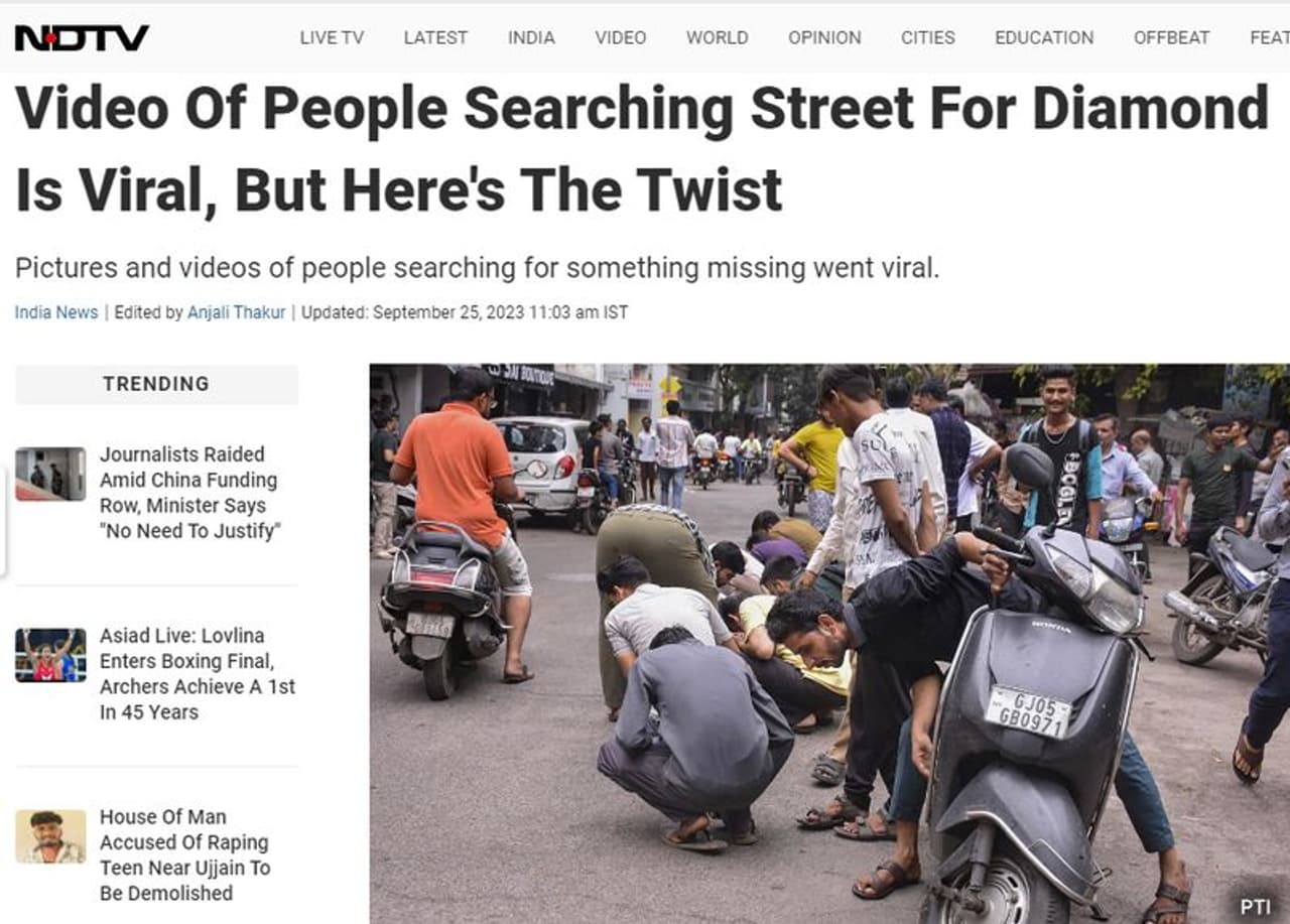 എന്നാല് കീവേഡുകള് ഉപയോഗിച്ച് ഇന്റര്നെറ്റില് നടത്തിയ തെരച്ചിലില് വ്യക്തമായത് സംഭവം സത്യമെങ്കിലും ചില തെറ്റിദ്ധരിപ്പിക്കലുകള് ഈ സംഭവത്തിന് പിന്നിലുണ്ട് എന്നാണ്. ഗുജറാത്തി മാധ്യമമായ എബിപി അസ്മിതയുടെ വാര്ത്തയില് പറയുന്നത് യഥാര്ഥ ഡയമണ്ട് അല്ല സിന്തറ്റിക് ഡയമണ്ടാണ് വ്യാപാരി റോഡിലേക്ക് വലിച്ചെറിഞ്ഞത് എന്നാണ്. കോടികള് വിലവരുന്ന ഡയമണ്ടുകള് തെരുവില് വിതറിയെന്ന അഭ്യൂഹം കേട്ട് ഇത് വാരിയെടുക്കാന് പ്രദേശവാസികള് തിടുക്കംകാട്ടിയെങ്കിലും പിന്നീടാണ് ഇവര്ക്ക് മനസിലായത് ഇതിന് അഞ്ച് രൂപ മാത്രമേ വിലയുള്ളൂ എന്നും വാര്ത്തയില് പറയുന്നു. സാരികളിലും വിലകുറഞ്ഞ ആഭരണങ്ങളിലും ഉപയോഗിക്കുന്ന തരം ഡയമണ്ടുകളാണിത്. ദേശീയ മാധ്യമമായ എന്ഡിടിവിയും ആളുകള്ക്ക് പറ്റിയ ഈ വലിയ അബദ്ധത്തെ കുറിച്ച് റിപ്പോര്ട്ട് ചെയ്തിട്ടുണ്ട്. സെപ്റ്റംബര് 25നായിരുന്നു എന്ഡിടിവിയില് വാര്ത്ത വന്നത്.