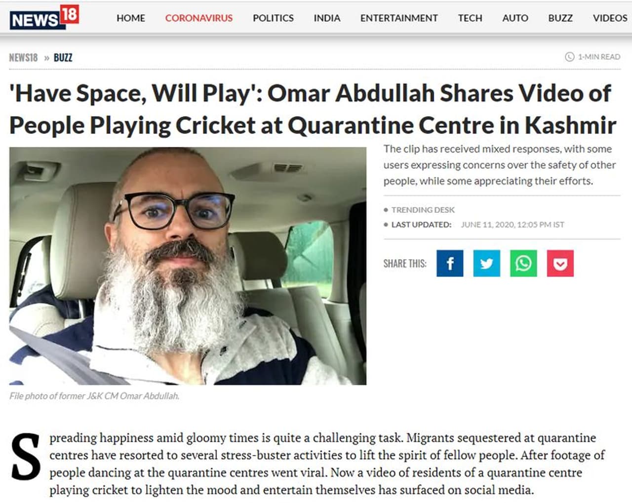 ഒമര് അബ്ദുള്ള പങ്കുവെച്ച വീഡിയോ കശ്മീരിലെ ക്വാറന്റീന് കേന്ദ്രത്തില് നിന്നുള്ളതാണ് എന്നാണ് ദേശീയ മാധ്യമങ്ങളുടെ റിപ്പോര്ട്ട്. ടൈംസ് ഓഫ് ഇന്ത്യയും മറ്റൊരു ദേശീയ മാധ്യമമായ ന്യൂസ് 18നും നല്കിയ വാര്ത്തയില് ഇക്കാര്യം തലക്കെട്ടില് തന്നെ നല്കിയിട്ടുണ്ട്.രണ്ട് വാര്ത്തകളുടെയും സ്ക്രീന്ഷോട്ട് ചുവടെ...
