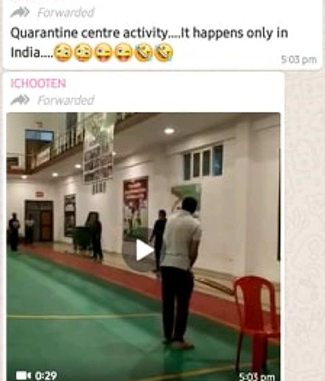 മുംബൈ: 'ക്വാറന്റീന് കേന്ദ്രത്തിലെ കാഴ്ചയാണിത്. ഇന്ത്യയില് മാത്രമേ ഇത് സംഭവിക്കൂ'...ഇന്ഡോറില് ഒരു കൂട്ടം ആളുകള് ക്രിക്കറ്റ് കളിക്കുന്ന വീഡിയോ വാട്സ്ആപ്പില് ഷെയര് ചെയ്യപ്പെടുന്നത് ഈ തലക്കെട്ടിലാണ്. എവിടെനിന്നുള്ളതാണ് ഈ വീഡിയോ, ക്വാറന്റീന് കേന്ദ്രത്തില് നിന്നുള്ളത് തന്നെയോ?.