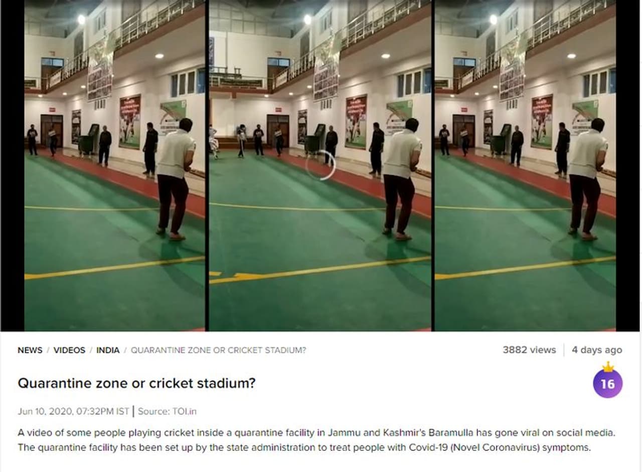 വൈറലായിരിക്കുന്ന വീഡിയോ കശ്മീരില് നിന്നുള്ളതാണ് എന്നാണ് ദേശീയ മാധ്യമങ്ങളുടെ റിപ്പോര്ട്ട്. എന്തായാലും ഗച്ചിഗൗളി സ്റ്റേഡിയമല്ല. സമീപത്തുള്ള ആശുപത്രി ബെഡുകള് ഇത് ക്വാറന്റീന് കേന്ദ്രം തന്നെയെന്ന് ഉറപ്പിക്കുന്നു. ക്രിക്കറ്റ് കളിക്കുന്നവരും ബെഡില് ഇരിക്കുന്നവരുമെല്ലാം മാസ്ക് ധരിച്ചിട്ടുണ്ട്.