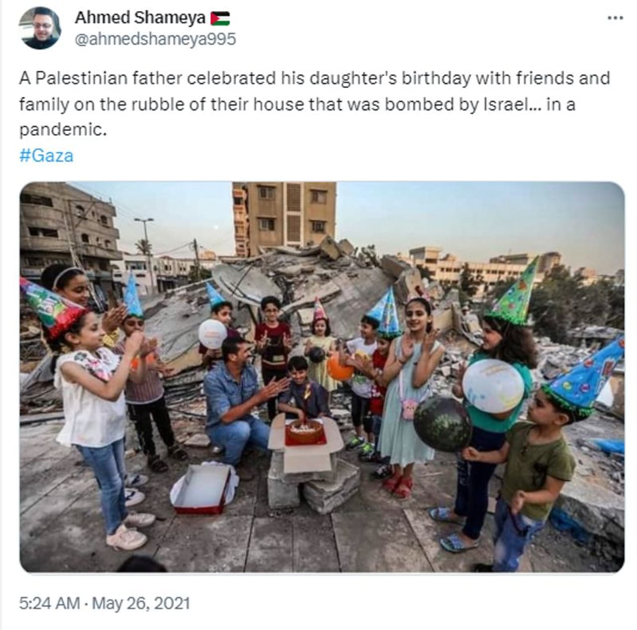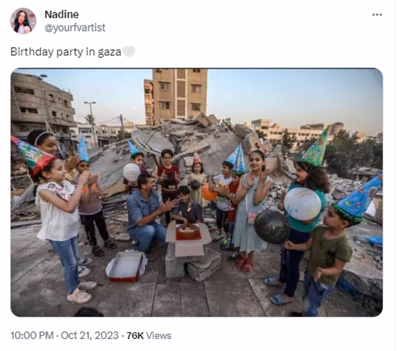'ഗാസയിലെ പിറന്നാളാഘോഷം' എന്ന കുറിപ്പോടെയാണ് സാമൂഹ്യമാധ്യമമായ എക്സില് (പഴയ ട്വിറ്റര്) നദൈന് എന്നയാളുടെ ട്വീറ്റ്. 2023 ഒക്ടോബര് 21ന് ചെയ്ത ട്വീറ്റ് ഇതിനകം 75000ത്തിലേറെ പേര് കണ്ടു. തകര്ന്ന കെട്ടിടങ്ങള്ക്ക് മധ്യേ നിലത്ത് അട്ടിവച്ച കല്ലിന് കഷണങ്ങള്ക്ക് മേല് കേക്ക് വച്ച് ഒരു ബാലന് മുറിക്കുന്നതാണ് ചിത്രത്തില്. പിറന്നാള് തൊപ്പികള് ധരിച്ച് ഏറെ കുട്ടികളെ ചിത്രത്തില് കാണാം എന്നതിനാല് ഇത് ജന്മദിനാഘോഷം തന്നെയെന്ന് ഉറപ്പിക്കാം. കുട്ടികള്ക്കൊപ്പം ഒരു മുതിര്ന്നയാളും ചിത്രത്തിലുണ്ട്.