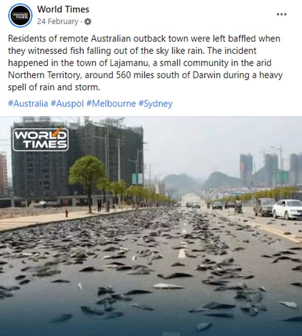റോഡില് നൂറുകണക്കിന് മീനുകള് കിടക്കുകയാണ് ചിത്രത്തില്. ഒരു നഗരപ്രദേശമാണിത് എന്ന് ഒറ്റനോട്ടത്തില് വ്യക്തം. 'ആകാശത്ത് നിന്ന് മീനുകള് വീണതോടെ ഇവിടുള്ള താമസക്കാര് അമ്പരന്നിരിക്കുകയാണ്. ഓസ്ട്രേലിയയിലെ നോര്ത്തേണ് ടെറിട്ടെറിയിലെ ചെറു പട്ടണമായ ലജാമനുവിലാണ് ഈ സംഭവമുണ്ടായത്. കനത്ത മഴയിലും കാറ്റിലുമാണ് ഈ പ്രതിഭാസമുണ്ടായത്' എന്നുമാണ് ചിത്രം പങ്കുവെച്ച് വേള്ഡ് ടൈംസ് എന്ന അക്കൗണ്ടില് നിന്നുള്ള ഫേസ്ബുക്ക് പോസ്റ്റ്. വേള്ഡ് ടൈംസ് മാത്രമല്ല മറ്റ് നിരവധി ഫേസ്ബുക്ക് അക്കൗണ്ടുകളില് നിന്നും സമാന അവകാശവാദത്തോടെ ചിത്രം പോസ്റ്റ് ചെയ്തിരിക്കുന്നതായി കാണാം.