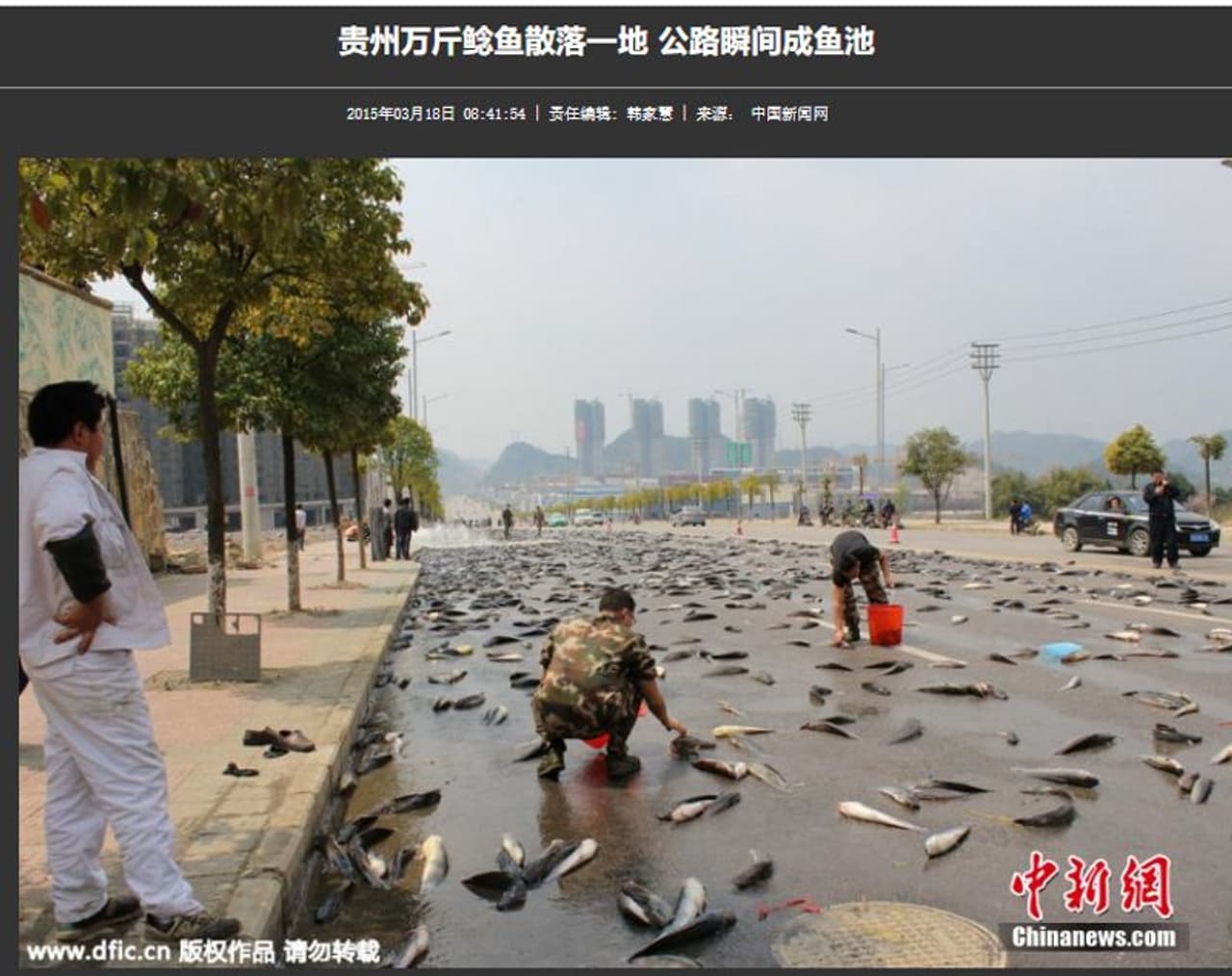 അപ്പോള് ഇപ്പോള് പ്രചരിക്കുന്ന ചിത്രം എവിടെ നിന്നുള്ളതാണ് എന്ന സംശയം എല്ലാവര്ക്കും വരാം. അത് ചൈനയില് നിന്നുള്ളതാണ് എന്നും വിശദമായ പരിശോധനയില് വ്യക്തമായിട്ടുണ്ട്. ചൈനയില് 2015ല് അബദ്ധത്തില് ഒരു ട്രക്കില് നിന്ന് റോഡിലേക്ക് തെറിച്ചുവീണ മീനുകളുടെ ചിത്രമാണിത്. ഈ സംഭവം അന്ന് ചൈനീസ് മാധ്യമങ്ങള് റിപ്പോര്ട്ട് ചെയ്തിരുന്നു. കണ്ടെയ്നറിന്റെ പൂട്ട് കൃത്യമായി ഇടാതിരുന്നതോടെയാണ് ഈ സംഭവമുണ്ടായത്.