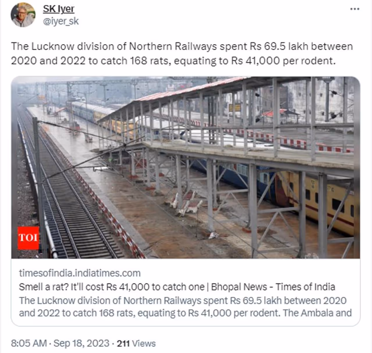 നോര്ത്തേണ് റെയില്വേയ്ക്ക് കീഴിലുള്ള ലക്നൗ ഡിവിഷനില് എലിയെ പിടിക്കാന് ചിലവഴിച്ച ഭീമന് തുകയെ കുറിച്ച് വിവിധ മാധ്യമങ്ങളാണ് റിപ്പോര്ട്ട് ചെയ്തത്