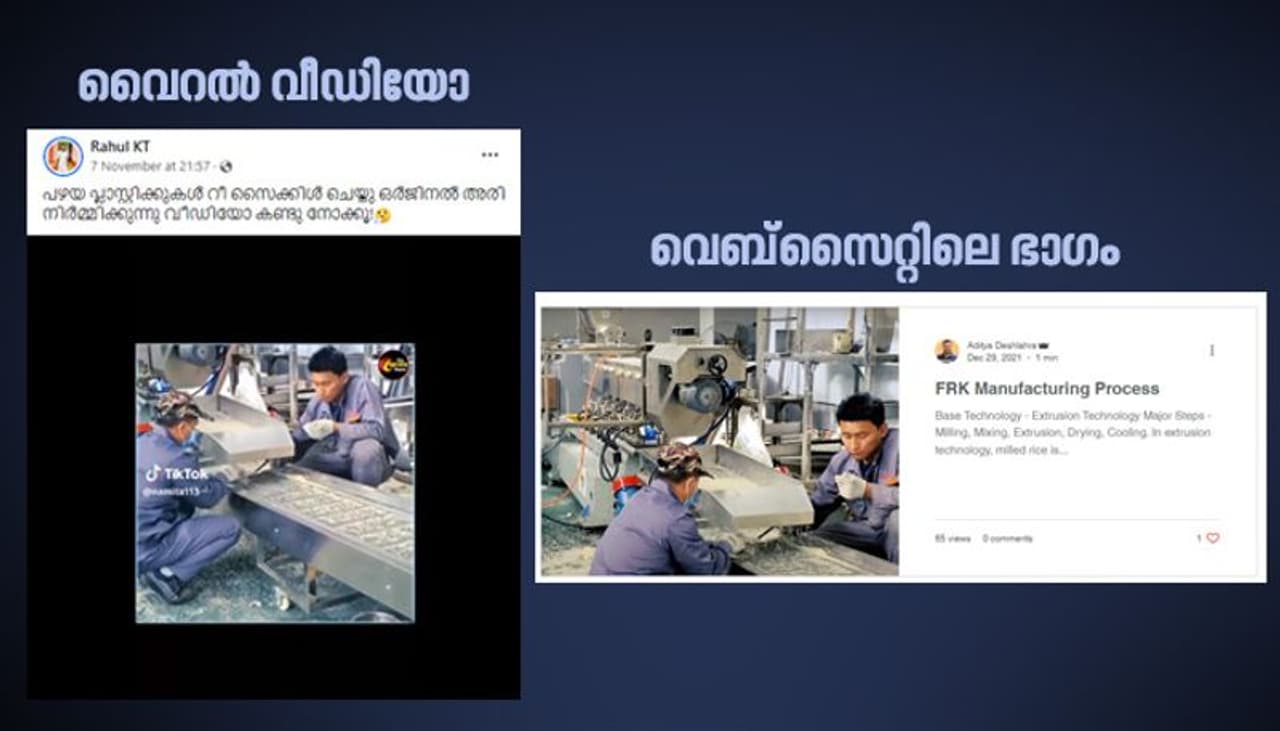 പഴയ പ്ലാസ്റ്റിക്കുകൾ റീ സൈക്കിൾ ചെയ്തു ഒറിജിനൽ അരി നിർമ്മിക്കുന്നു, വീഡിയോ കണ്ടു നോക്കൂ! എന്ന് മലയാളത്തിലുള്ള തലക്കെട്ടോടെയാണ് വീഡിയോ ഫേസ്ബുക്കില് രാഹുല് കെ.ടി എന്ന യൂസര് 2023 നവംബര് ഏഴാം തിയതി പോസ്റ്റ് ചെയ്തിരിക്കുന്നത്. അരിയോട് സാദൃശ്യമുള്ള എന്തോ പദാര്ഥം നിര്മ്മിക്കുന്നതിന്റെ വിവിധ ഘട്ടങ്ങള് വിശദീകരിക്കുന്നതാണ് വീഡിയോ. അരിയെയും ചോറിനേയും കൂടാതെ പ്ലാസ്റ്റിക് ശേഖരിക്കുന്നതിന്റെയും റീ സൈക്കിള് ചെയ്യുന്നതിന്റേയും ദൃശ്യങ്ങളും ഈ വീഡിയോയിലുണ്ട്. അരിക്കൊപ്പം പ്ലാസ്റ്റിക്കും കാണിക്കുന്നതാണ് പ്ലാസ്റ്റിക് അരി നിര്മ്മിക്കുന്ന പ്രൊസസാണ് വീഡിയോയില് എന്ന ബലം സംശയപ്പെടുത്തുന്നത്. എന്നാല് ഇത് വ്യാജ വീഡിയോയാണെന്ന് പറയുന്നവരെയും പ്ലാസ്റ്റിക് പുഴുങ്ങിയാല് ചോറാവുമോ എന്ന് ചോദിക്കുന്നവരെയും വീഡിയോയ്ക്ക് താഴെ കമന്റ് ബോക്സില് കാണാം.