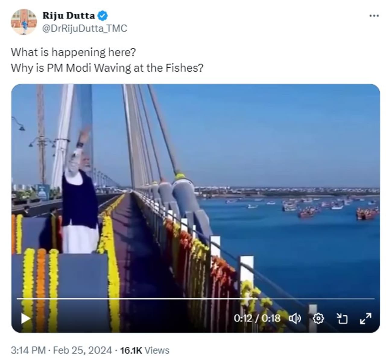 എന്താണ് ഇവിടെ സംഭവിക്കുന്നത്? എന്തിനാണ് പ്രധാനമന്ത്രി നരേന്ദ്ര മോദി മീനുകളെ കൈവീശി കാണിക്കുന്നത്? എന്നീ ചോദ്യങ്ങളോടെയാണ് 18 സെക്കന്ഡ് ദൈര്ഘ്യമുള്ള വീഡിയോ സഹിതം തൃണമൂല് കോണ്ഗ്രസ് വക്താവ് റിജു ദത്തയുടെ ട്വീറ്റ്. പതിനാറായിരത്തിലേറെ പേര് ഇതിനകം ഈ വീഡിയോ കണ്ടുകഴിഞ്ഞു. പ്രധാനമന്ത്രി നരേന്ദ്ര മോദി ഒരു പാലത്തിലൂടെ നടന്നുവരുന്നതും ദൂരേക്ക് നോക്കി കൈവീശിക്കാണിക്കുന്നതുമാണ് വീഡിയോയിലുള്ളത്.