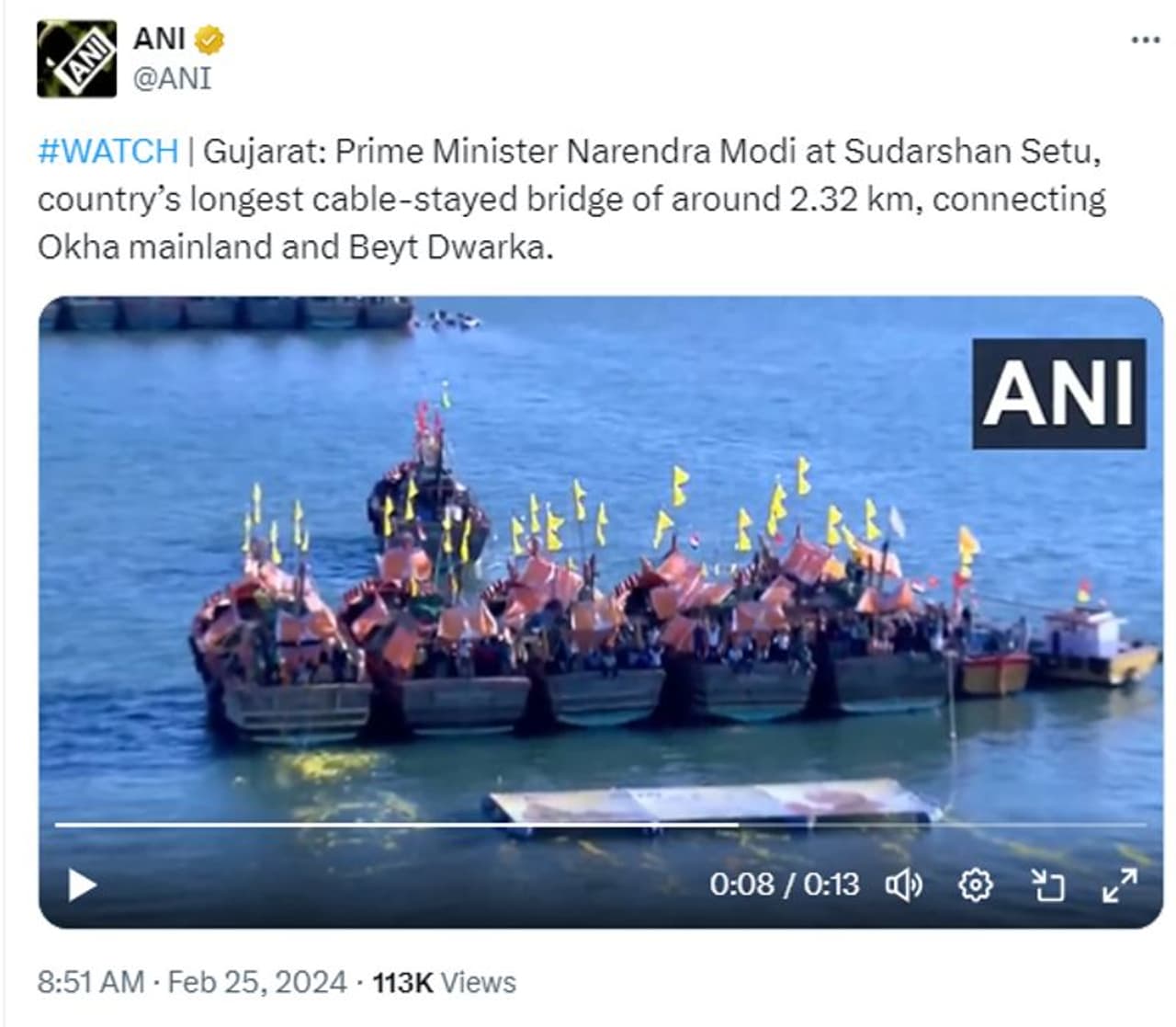 വീഡിയോ കണ്ടതിന്റെ അടിസ്ഥാനത്തില് നടത്തിയ കീവേഡ് സെര്ച്ചില് വാര്ത്താ ഏജന്സിയായ എഎന്ഐ 2024 ഫെബ്രുവരി 25ന് ചെയ്തിരിക്കുന്ന ഒരു ട്വീറ്റ് കാണാനായി. മോദി ഗുജറാത്തിലെ സുദര്ശന് സേതുവിന്റെ ഉദ്ഘാടന ചടങ്ങിന് എത്തിയതിന്റെ ദൃശ്യങ്ങളാണിത്. രാജ്യത്തെ ഏറ്റവും വലിയ കേബിള് പാലമാണ് സുദര്ശന് സേതു. 2.32 കിലോമീറ്ററാണ് ഇതിന്റെ നീളം. സുദര്ശന് സേതുവില് എത്തിയ മോദി കൈവീശിക്കാണിക്കുന്നത് മത്സ്യതൊഴിലാളികളെയാണ് എന്ന് എഎന്ഐയുടെ വീഡിയോയില് നിന്ന് വ്യക്തമാണ്. പ്രധാനമന്ത്രി കൈവീശി കാണിക്കുമ്പോള് ബോട്ടുകളില് നിന്ന് മത്സ്യതൊഴിലാളികള് പുഷ്പവൃഷ്ടി നടത്തുന്നത് വീഡിയോയിലുണ്ട്.