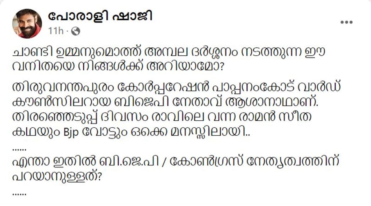 'ചാണ്ടി ഉമ്മനുമൊത്ത് അമ്പല ദർശനം നടത്തുന്ന ഈ വനിതയെ നിങ്ങൾക്ക് അറിയാമോ? തിരുവനന്തപുരം കോർപ്പറേഷൻ പാപ്പനംകോട് വാർഡ് കൗൺസിലറായ ബിജെപി നേതാവ് ആശാനാഥാണ്. തെരഞ്ഞെടുപ്പ് ദിവസം രാവിലെ വന്ന രാമൻ സീത കഥയും BJP വോട്ടും ഒക്കെ മനസിലായി. എന്താ ഇതിൽ ബി.ജെ.പി/ കോൺഗ്രസ് നേതൃത്വത്തിന് പറയാനുള്ളത്?'- ഇതാണ് ഫേസ്ബുക്കിലൂടെ പോരാളി ഷാജിയുടെ ചോദ്യം. സമാനമായ നിരവധി പോസ്റ്റുകൾ ഫേസ്ബുക്കിൽ കാണാം.