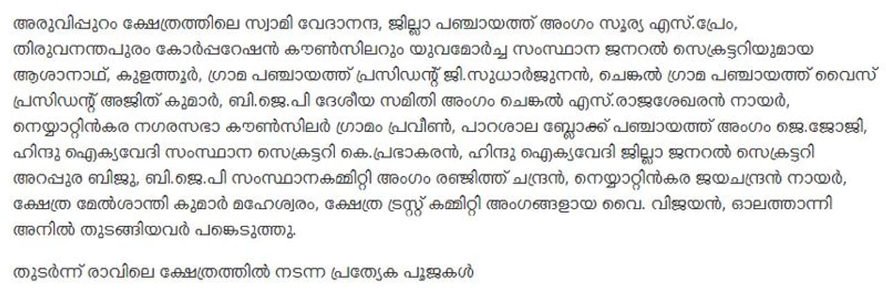 ചെങ്കല് ക്ഷേത്രത്തിലെത്തിയ ചാണ്ടി ഉമ്മന് തുലാഭാരം നടത്തിയതായും മാധ്യമവാർത്തകള് കാണാം. വീഡിയോ കാണാന് ക്ലിക്ക് ചെയ്യുക. ഈ വീഡിയോയിലും വിവിധ രാഷ്ട്രീയ പാര്ട്ടി നേതാക്കളുടെ സാന്നിധ്യം കാണാനാവുന്നതാണ്. ഇക്കാരണങ്ങള് കൊണ്ടുതന്നെ ചാണ്ടി ഉമ്മനും ബിജെപിയുടെ വനിതാ കൗൺസിലറും ഒന്നിച്ച് ക്ഷേത്രം സന്ദർശനം നടത്തി എന്നത് ആളുകളെ തെറ്റിദ്ധരിപ്പിക്കുന്ന പ്രചാരണമാണ്. ചാണ്ടി ഉമ്മനൊപ്പം സിപിഎം നേതാക്കളുള്പ്പടെ പരിപാടിയില് പങ്കെടുത്തിരുന്നു. സിപിഎം നേതാക്കളുള്പ്പടെയുള്ളവരുള്ള ചിത്രങ്ങളില് നിന്ന് ചാണ്ടി ഉമ്മനും ആശാനാഥുമുള്ള ചിത്രം മാത്രം എടുത്താണ് വ്യാജ പ്രചാരണം തകൃതിയായി നടക്കുന്നത്.