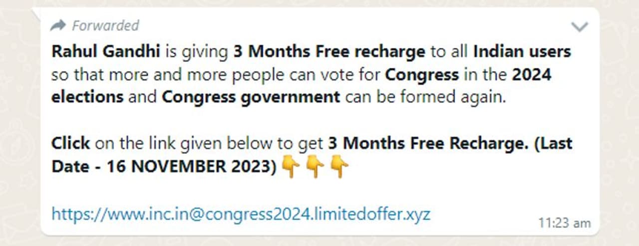'2024ലെ പൊതുതെരഞ്ഞെടുപ്പില് ഇന്ത്യന് നാഷണല് കോണ്ഗ്രസിനായി കൂടുതല് പേര് വോട്ട് ചെയ്യാനും സര്ക്കാര് രൂപീകരിക്കുവാനുമായി രാഹുല് ഗാന്ധി മൂന്ന് മാസത്തെ സൗജന്യ മൊബൈല് റീച്ചാര്ജ് എല്ലാ ഇന്ത്യന് ഉപയോക്താക്കള്ക്കും നല്കുന്നു. മൂന്ന് മാസത്തെ സൗജന്യ മൊബൈല് റീച്ചാര്ജ് ലഭിക്കാനായി താഴെയുള്ള ലിങ്കില് ക്ലിക്ക് ചെയ്യുക. 2023 നവംബര് 16-ാം തിയതിയാണ് ഈ ഓഫര് ലഭിക്കാനുള്ള അവസാന തിയതി' എന്നുമാണ് വാട്സ്ആപ്പ് സന്ദേശത്തില് പറയുന്നത്. https://www.inc.in@congress2024.limitedoffer.xyz എന്ന വെബ്സൈറ്റ് ലിങ്കാണ് സൗജന്യ മൊബൈല് റീച്ചാര്ജിനായി വാട്സ്ആപ്പ് സന്ദേശത്തിനൊപ്പം നല്കിയിരിക്കുന്നത്.