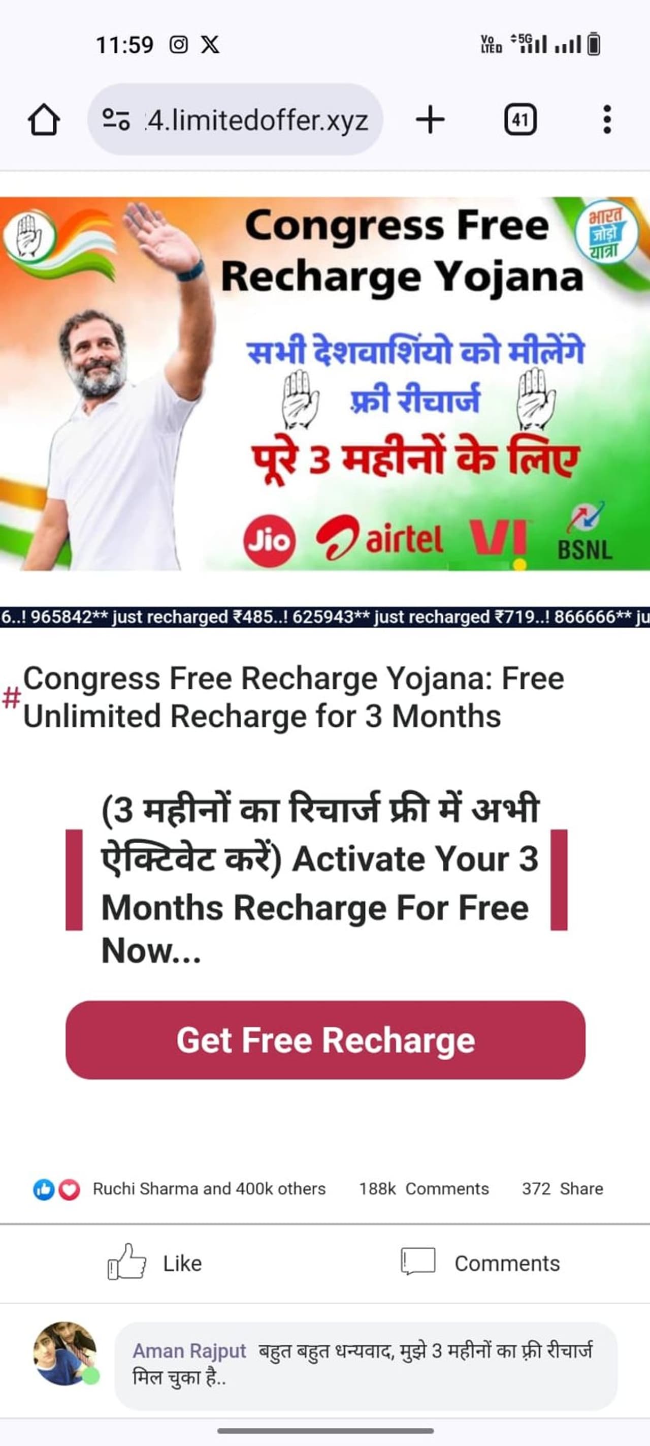 2. https://www.inc.in@congress2024.limitedoffer.xyz എന്ന ലിങ്ക് വഴി മൊബൈല് ഫോണുകള് സൗജന്യമായി റീച്ചാര്ജ് ചെയ്യാനാകുമോ എന്നും പരിശോധിച്ചു. ലിങ്കില് ക്ലിക്ക് ചെയ്ത് കൂടുതലായി പരിശോധിച്ചപ്പോള് 'കോണ്ഗ്രസ് ഫ്രീ റിച്ചാര്ജ് യോജന' (Congress Free Recharge Yojana) എന്നാണ് പദ്ധതിയുടെ പേര് എന്ന് മനസിലായി. 'Congress Free Recharge Yojana' എന്ന കീവേഡ് ഉപയോഗിച്ച് സെര്ച്ച് എഞ്ചിനുകളില് പരിശോധിച്ചപ്പോള് ഇങ്ങനെയൊരു സൗജന്യ മൊബൈല് റീച്ചാര്ജ് ഓഫര് ഉള്ളതായി ആധികാരികമായ വാര്ത്തകളൊന്നും കണ്ടെത്താന് സാധിച്ചില്ല.