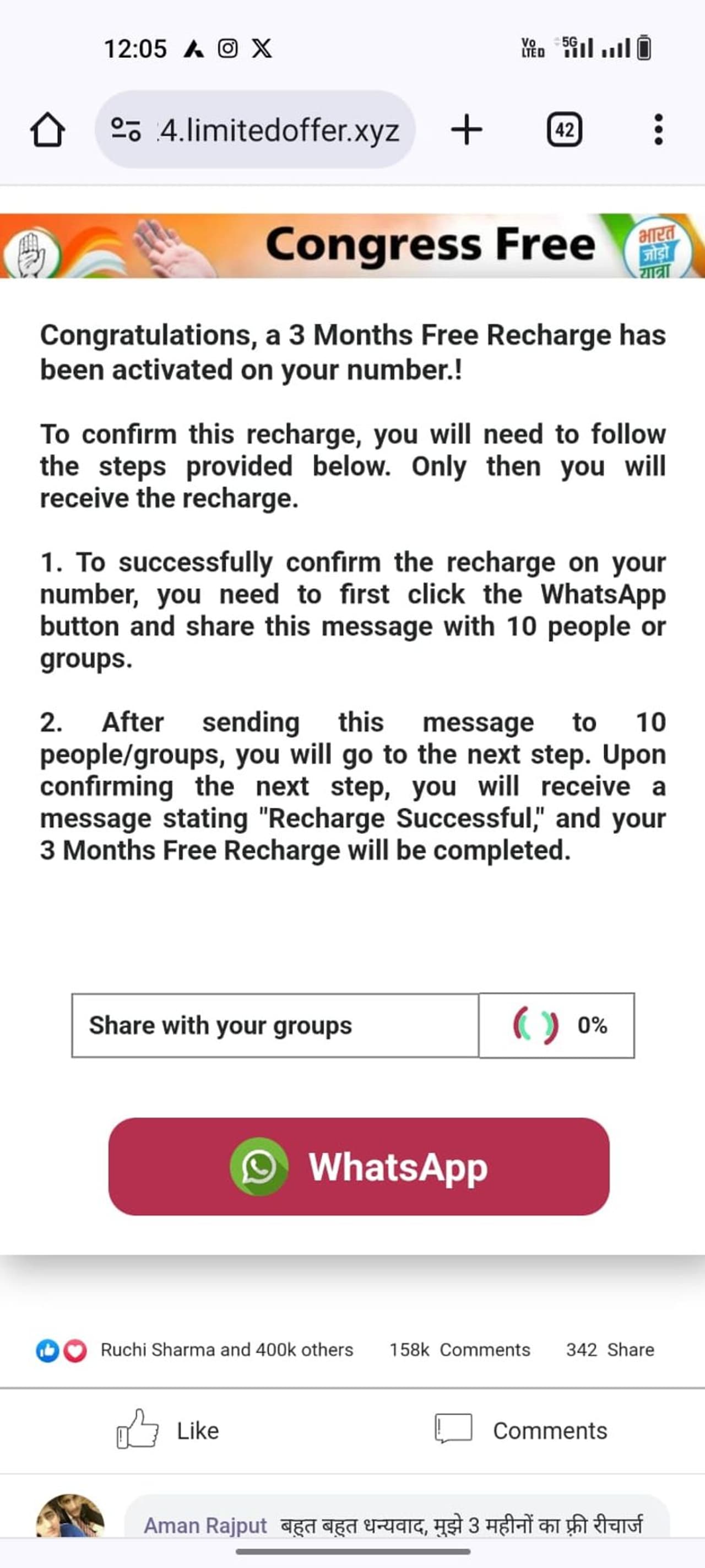 3. അതേസമയം ജിയോ, എയര്ടെല്, വോഡാഫോണ്, ബിഎസ്എന്എല് സര്വീസുകളില് സൗജന്യ റീച്ചാര്ജ് ലഭ്യമാണ് എന്നും പ്രചരിക്കുന്ന ലിങ്കില് ക്ലിക്ക് ചെയ്തപ്പോള് ലഭിച്ച വെബ്സൈറ്റിലെ വിവരങ്ങളിലുണ്ട്. ഇതുവഴി റീച്ചാര്ജ് ചെയ്യാനായി ശ്രമിച്ചപ്പോള് വാട്സ്ആപ്പില് 10 പേര്ക്കോ ഗ്രൂപ്പുകളിലേക്കോ ഈ സന്ദേശം ഷെയര് ചെയ്താല് മാത്രമേ റീച്ചാര്ജ് ആക്റ്റീവാവുകയുള്ളൂ എന്ന് മുന്നറിയിപ്പ് നല്കിയിരിക്കുന്നതായും കണ്ടു. സാങ്കേതികമായി ഇത്തരത്തില് മൊബൈല് റീച്ചാര്ജ് പ്ലാന് ആക്റ്റീവാവാന് സാധ്യതയില്ലാത്തതിനാല് വൈറല് സന്ദേശം വ്യാജമാണ് എന്ന് ഇതോടെ ഉറപ്പായി.