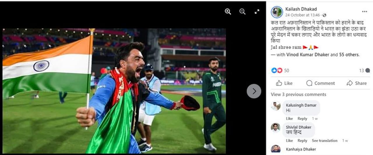 പാകിസ്ഥാനെതിരായ ജയത്തിന് ശേഷം റാഷിദ് ഖാന് ഇന്ത്യന് പതാക കയ്യിലേന്തിയാണ് ആഘോഷിച്ചത് എന്നാണ് സോഷ്യല് മീഡിയയിലെ പ്രചാരണം