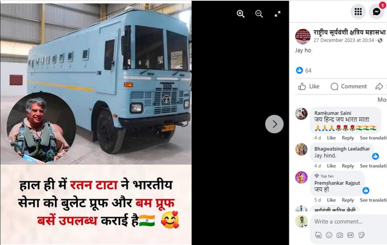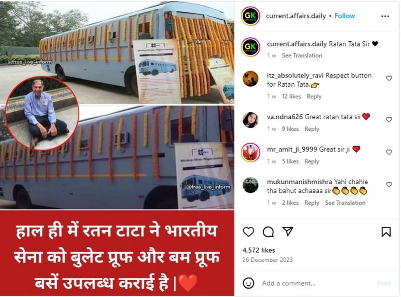 ഇന്ത്യന് ആര്മിക്ക് രത്തന് ടാറ്റ ബുള്ളറ്റ് പ്രൂഫ് ബസുകള് നല്കിയതായാണ് വിവിധ ഫേസ്ബുക്ക് പോസ്റ്റുകളില് പറയുന്നത്. സമാന തരത്തിലുള്ള പോസ്റ്റുകള് ഇന്സ്റ്റഗ്രാമിലും കാണാം. ഇന്ത്യന് സൈന്യത്തിന്റെ സുരക്ഷയ്ക്കായി മുന്കൈയെടുത്ത അദേഹത്തിനെ പ്രശംസിക്കുന്ന തരത്തിലാണ് സാമൂഹ്യമാധ്യമങ്ങളിലെ പോസ്റ്റുകളെല്ലാം. രത്തന് ടാറ്റയുടെയും ബസുകളുടെയും ചിത്രങ്ങള് സഹിതമാണ് പോസ്റ്റുകള്.