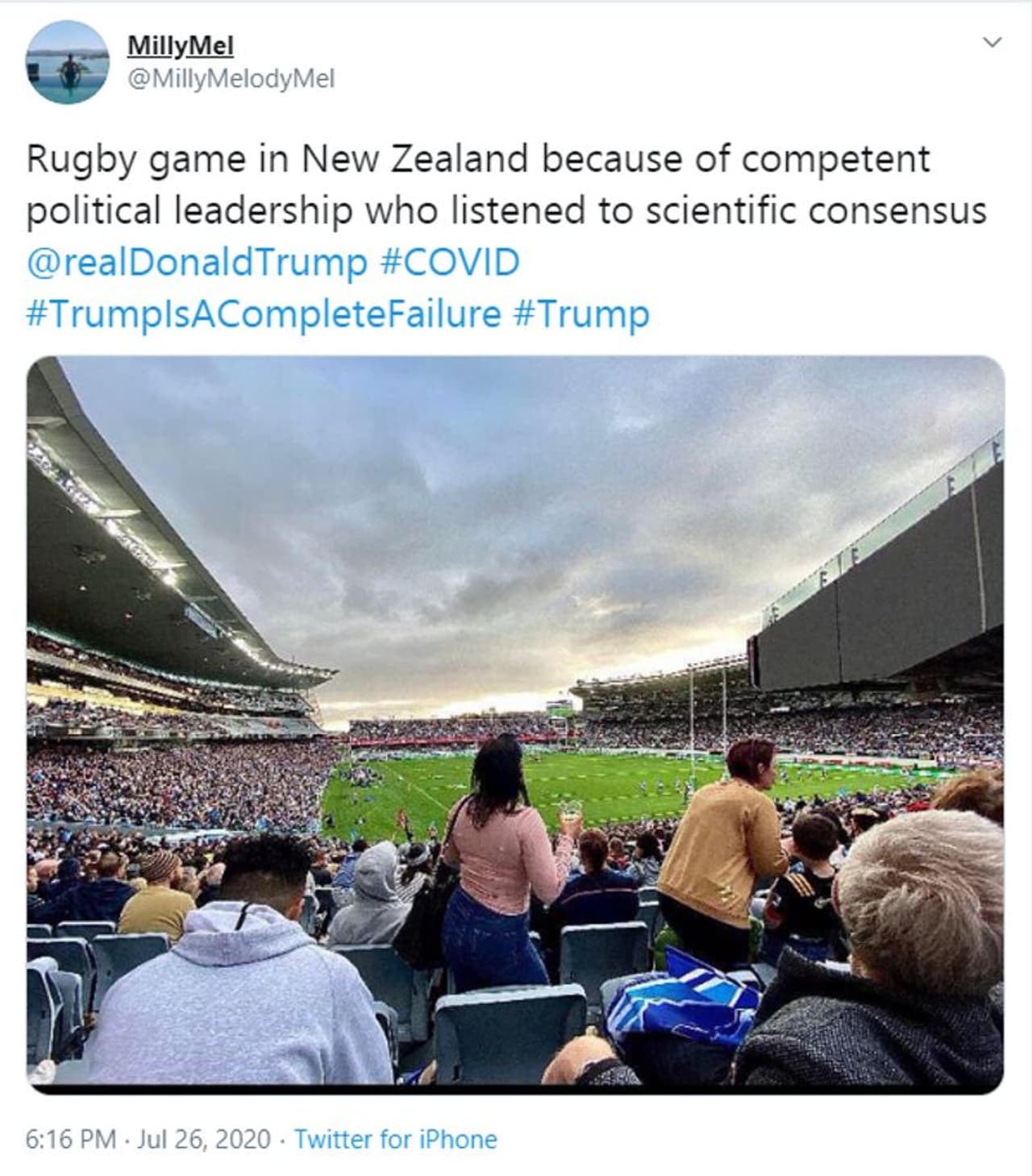 സാമൂഹ്യമാധ്യമമായ ട്വിറ്ററില് തിങ്ങിനിറഞ്ഞ ഗാലറിയുടെ ചിത്രം സഹിതമാണ് പ്രചാരണം. ശാസ്ത്രീയമായി പരിഹാരം കാണുന്ന മികച്ച രാഷ്ട്രീയ നേതൃഗുണം കാരണം ന്യൂസിലന്ഡില് കാണാനായ റഗ്ബി മത്സരം എന്ന കുറിപ്പോടെയാണ് ട്വീറ്റുകള്. മത്സരം നടന്നത് ന്യൂസിലന്ഡിലാണെങ്കിലും ട്വീറ്റുകളെല്ലാം ഉന്നംവയ്ക്കുന്നത് അമേരിക്കന് പ്രസിഡന്റ് ഡോണള്ഡ് ട്രംപിനെയാണ്. ട്രംപ് പൂര്ണ പരാജയമാണ് (#TrumpIsACompleteFailure) എന്ന ഹാഷ്ടാഗോടെയാണ് പോസ്റ്റുകളെല്ലാം.