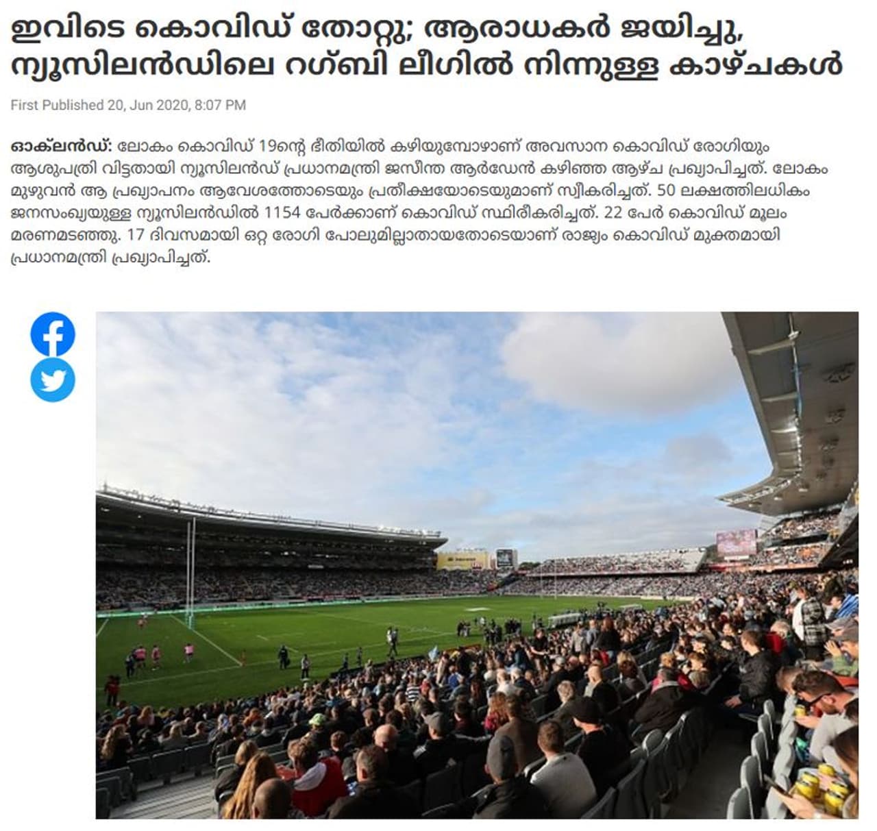 കാണികള് ആഘോഷമാക്കിയ മത്സരത്തെ കുറിച്ച് ഏഷ്യാനെറ്റ് ന്യൂസ് ഓണ്ലൈന് വാര്ത്ത നല്കിയിരുന്നു. 'ഇവിടെ കൊവിഡ് തോറ്റു; ആരാധകര് ജയിച്ചു, ന്യൂസിലന്ഡിലെ റഗ്ബി ലീഗില് നിന്നുള്ള കാഴ്ചകള്' എന്ന തലക്കെട്ടിലാണ് വാര്ത്ത. 'ഓക്ലന്ഡിലെ ഈഡന് പാര്ക്കില് 90 ദിവസത്തെ ഇടവേളയ്ക്ക് ശേഷം ജൂണ് 14ന് ഓക്ലന്ഡ് ബ്ലൂസും വെല്ലിംഗ്ടണ് ഹറികെയ്ന്സും തമ്മില് അരങ്ങേറിയ സൂപ്പര് റഗ്ബി ടൂര്ണമെന്റില് 43,000 കാണികളെത്തി. 15 വര്ഷത്തിനിടയിലെ റെക്കോര്ഡ് കാണികളാണ് ഇത്' എന്ന് തുടങ്ങിയ വിവരങ്ങള് റിപ്പോര്ട്ടിലുണ്ട്. ഇതിലുള്ളതും ചിത്രത്തിലെ സമാന സ്റ്റേഡിയം.