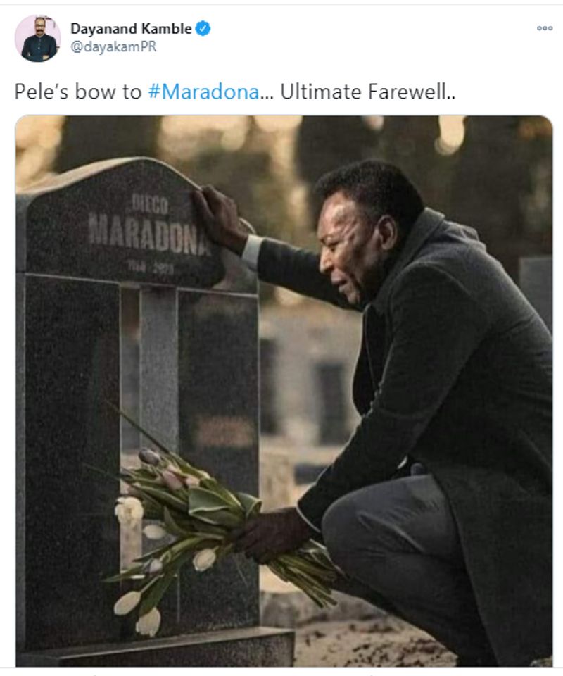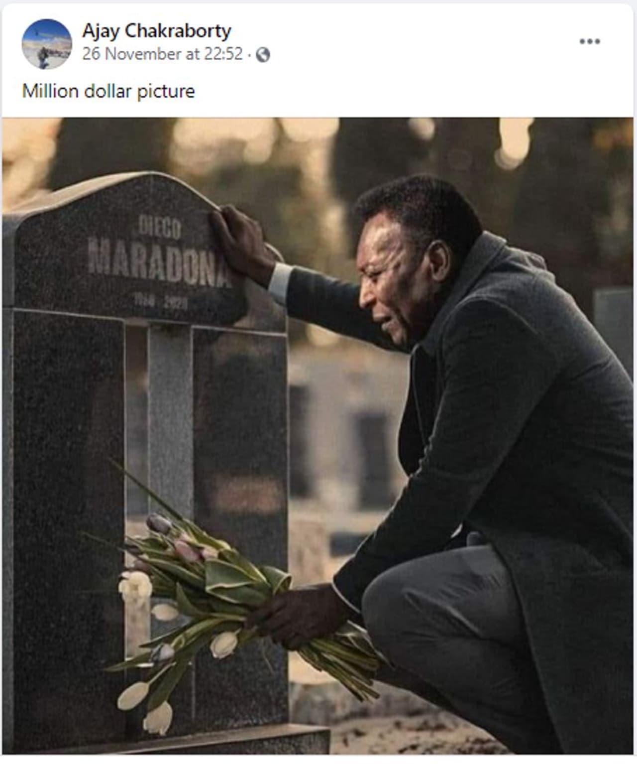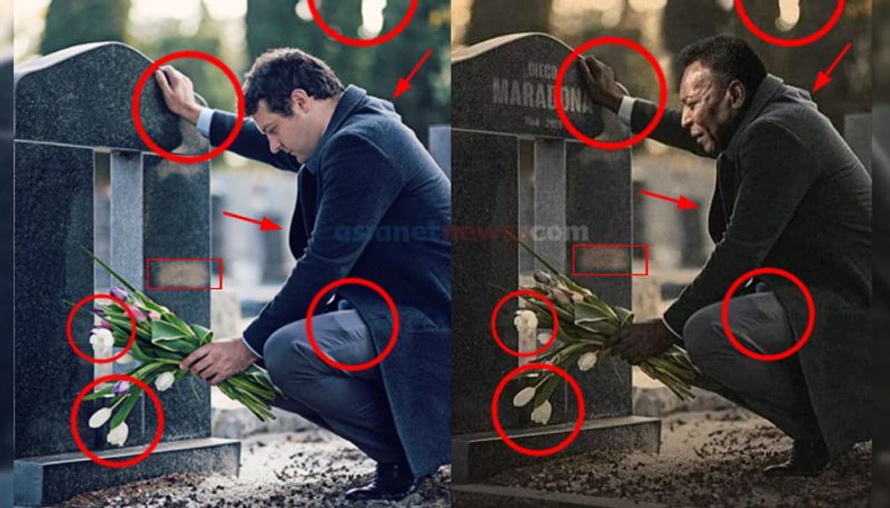1. പെലെയുടെ ചിത്രത്തിന്റെ ഒറിജിനല് റിവേഴ്സ് ഇമേജ് സെര്ച്ചില് ലഭ്യമായി. ഗെറ്റി ഇമേജസാണ് യഥാര്ഥ ചിത്രം പ്രസിദ്ധീകരിച്ചിട്ടുള്ളത്. ചിത്രത്തിലുള്ള ആളുടെ സ്ഥാനത്ത് പെലെയെ എഡിറ്റ് ചെയ്ത് ചേര്ക്കുകയും കല്ലറയില് മറഡോണ എന്ന് എഴുതിച്ചേര്ക്കുകയുമായിരുന്നു.