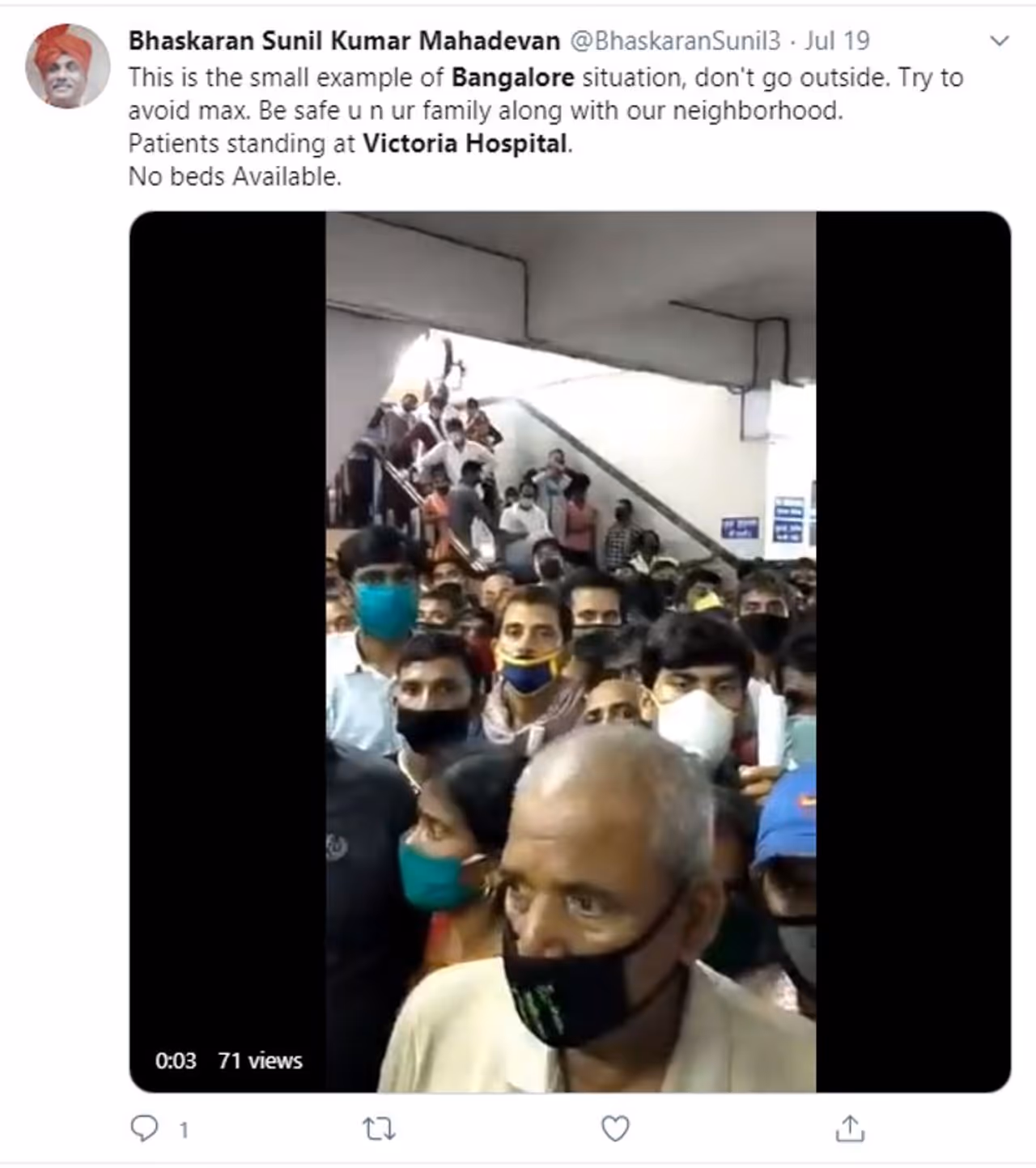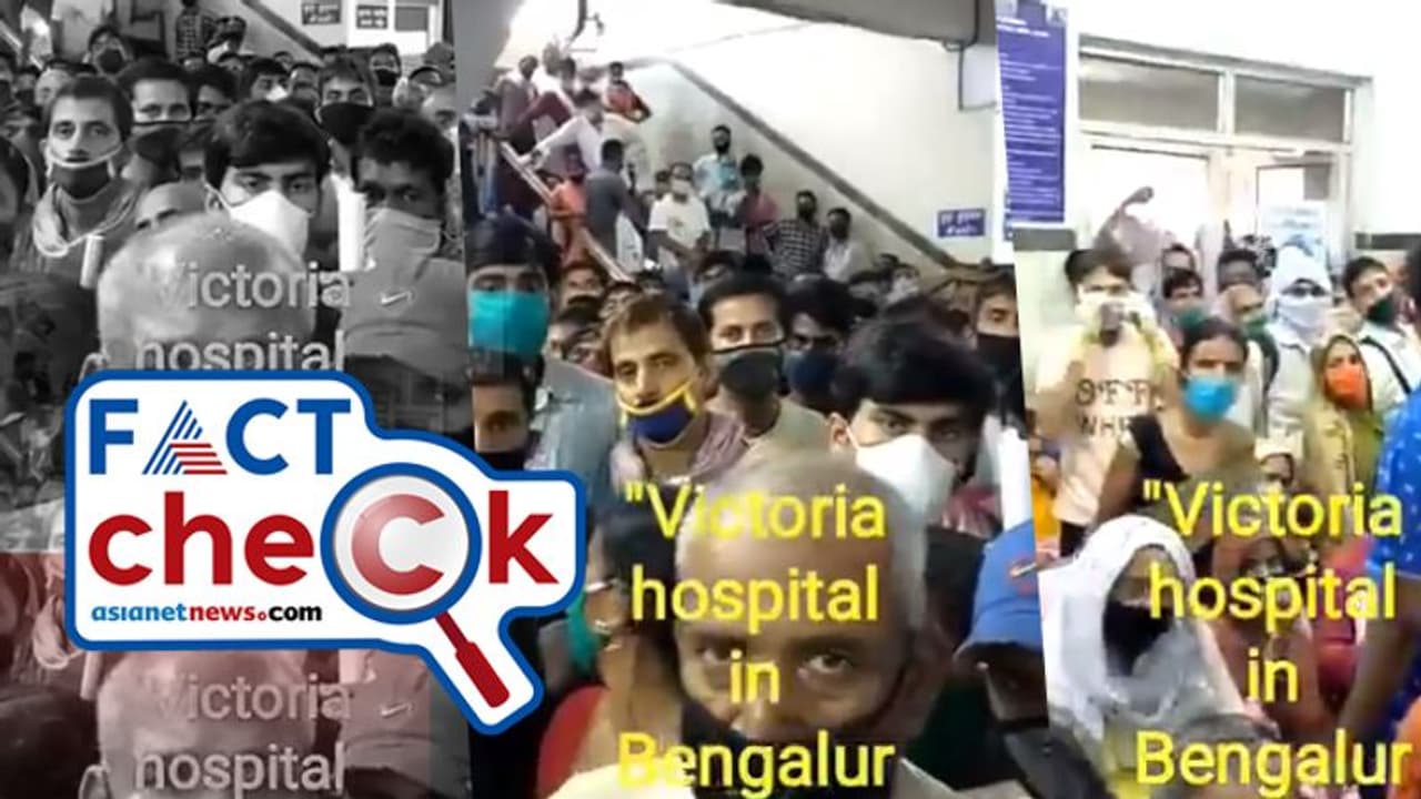 ബെംഗളൂരുവിൽ കൊവിഡ് രോഗികളെ ചികിൽസിക്കുന്ന വിക്ടോറിയ ആശുപത്രിയുടെ ദാരുണമായ അവസ്ഥയാണിത്. രോഗികളെയും പരിശോധനയ്ക്ക് എത്തിയവരെയും കൊണ്ട് ആശുപത്രി നിറഞ്ഞിരിക്കുന്നു. ആരും വീടിന് പുറത്തിറങ്ങരുത്. ആശുപത്രിയിൽ ഒരു ബെഡ് പോലും ബാക്കിയില്ല എന്നൊക്കെയായിരുന്നു പ്രചാരണം. മാസ്ക് അണിഞ്ഞ വലിയൊരു കൂട്ടം ആളുകള് സാമൂഹ്യ അകലം പാലിക്കാതെ ഔട്ട് പേഷ്യന്റ് വാര്ഡിന് പുറത്ത് തിങ്ങിക്കൂടി നില്ക്കുന്നതായിരുന്നു വീഡിയോയില്.