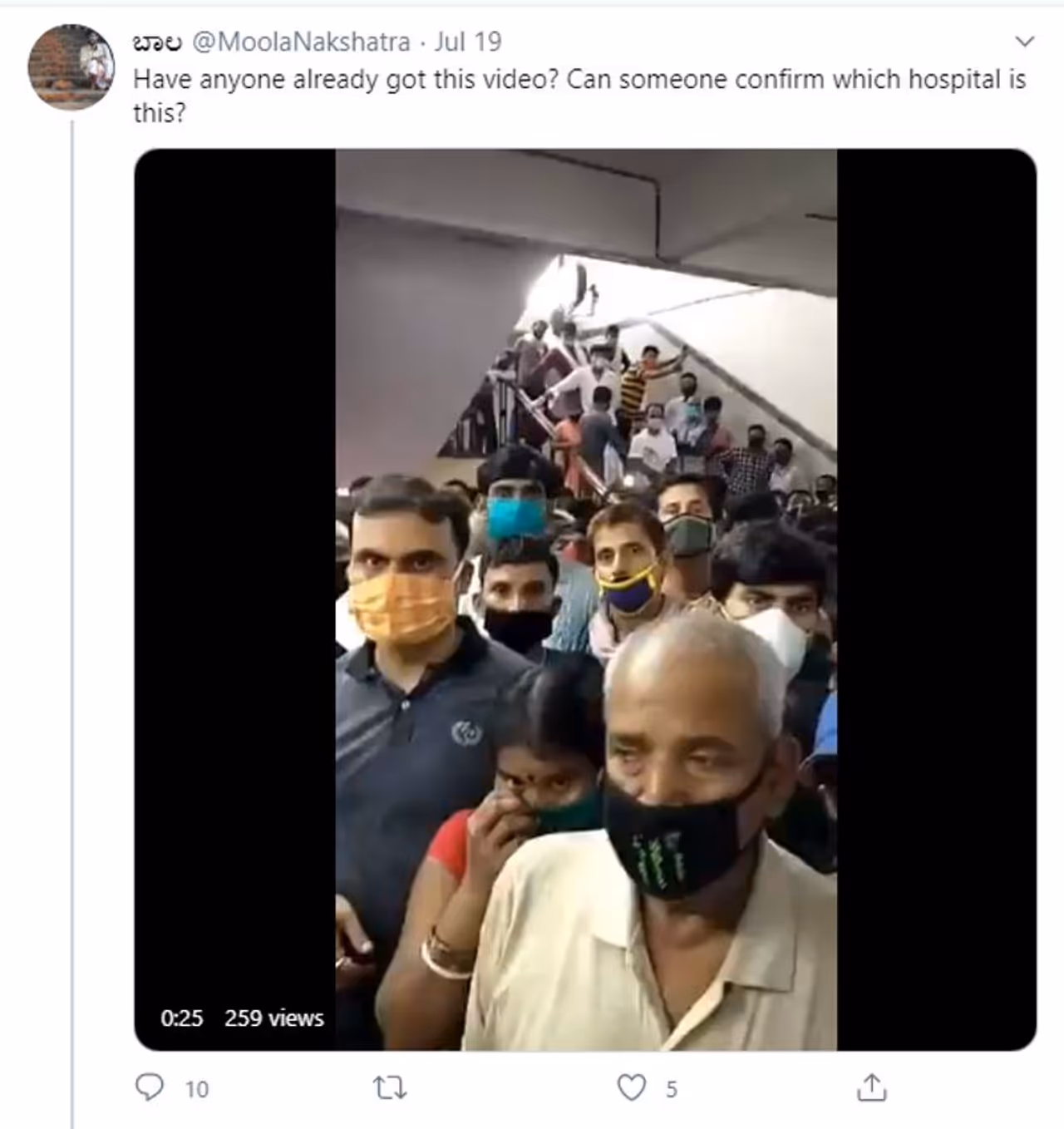 പ്രചരിക്കുന്ന വീഡിയോ ബെംഗളൂരുവിൽ നിന്നുള്ളതല്ല എന്ന് സിറ്റി പൊലീസ് നേരത്തെ വ്യക്തമാക്കിയിരുന്നു. ഈ വീഡിയോ പാറ്റ്നയിലെ മഹാവീർ കാൻസർ സെന്ററിൽ നിന്നുള്ളതാണ് എന്നാണ് ഇപ്പോൾ തെളിഞ്ഞിരിക്കുന്നത്. ചില രോഗികള്ക്കും സ്റ്റാഫിനും കൊവിഡ് 19 സ്ഥിരീകരിച്ചതോടെ ഒരാഴ്ചക്കാലം ആശുപത്രി അടച്ചിട്ടിരുന്നു. ജൂലൈ 15ന് ആശുപത്രി വീണ്ടും തുറന്നപ്പോള് പരിശോധനകള്ക്കായി എത്തിയ രോഗികളുടെ കൂട്ടമാണ് വൈറലായ വീഡിയോയിലുള്ളത്.