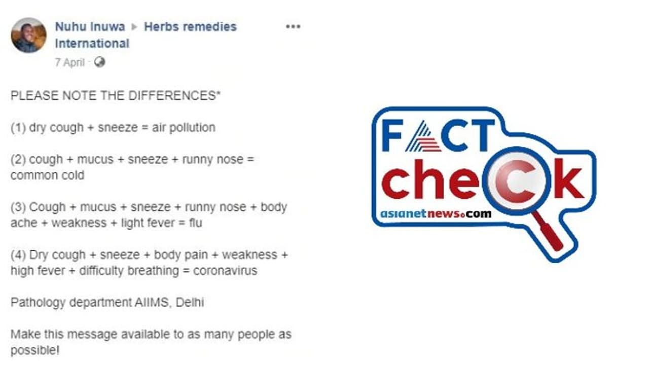 ശ്വസന സംബന്ധമായുണ്ടാകുന്ന ബുദ്ധിമുട്ടുകളെ മറ്റ് അസുഖങ്ങളുമായി താരതമ്യം ചെയ്യുന്ന രീതിയിലുള്ള എയിംസിന്റെ പഠനം എന്ന സന്ദേശം തെറ്റിധരിപ്പിക്കുന്നതും എയിംസിന്റെ പേര് ദുരുപയോഗം ചെയ്യുന്നതുമാണ്.