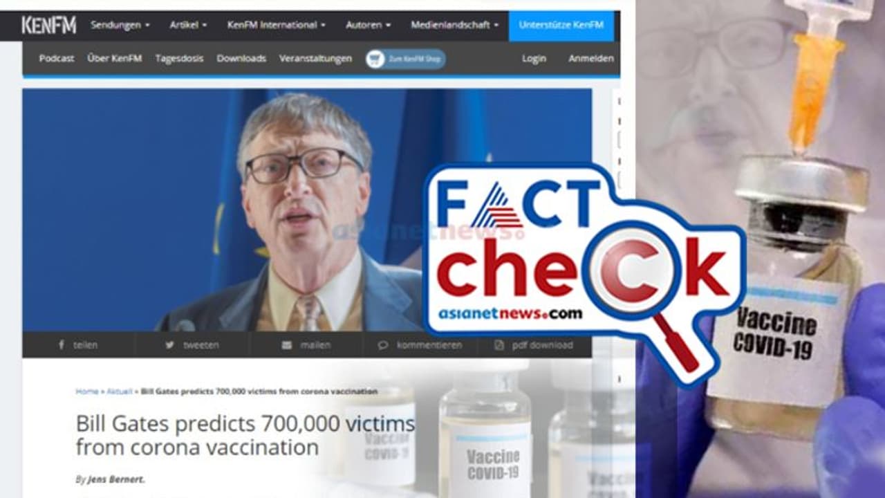 കൊവിഡ് 19 വാക്സിന് സ്വീകരിക്കുന്നവരില് ഏഴുലക്ഷം പേര്ക്ക് മരണമോ മറ്റ് ഗുരുതര പ്രത്യാഘാതങ്ങളോ ഉണ്ടാവുമെന്ന നിലയ്ക്കാണ് പ്രചാരണം. ഈ വര്ഷം ആദ്യം നടന്ന ഒരു അഭിമുഖത്തിലെ പരാമര്ശത്തോടൊപ്പമുള്ള ലേഖനമാണ് സമൂഹമാധ്യമങ്ങളില് വൈറലായിട്ടുള്ളത്. സമാന്തര നിരീക്ഷണങ്ങളുടെ പേരില് ഏറെ ചര്ച്ചയായിട്ടുള്ള ജര്മ്മന് വെബ്സൈറ്റായ കെന് എഫ്എമ്മിലാണ് ഇത് സംബന്ധിച്ച ലേഖനമുള്ളത്. ജര്മ്മനിയില് മാത്രം 8300 വാക്സിന് ഇരകള് ഉണ്ടാവുമെന്ന് ബില് ഗേറ്റ്സ് പറഞ്ഞതായാണ് ലേഖനം അവകാശപ്പെടുന്നത്.