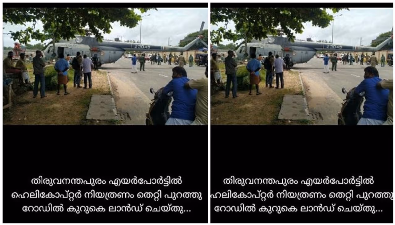 തിരുവനന്തപുരം വിമാനത്താവളത്തില് ഹെലികോപ്റ്റര് നിയന്ത്രണം തെറ്റി വിമാനത്താവളത്തിന് പുറത്ത് റോഡില് ലാന്ഡ് ചെയ്തുവെന്ന രീതിയില് നടക്കുന്ന പ്രചാരണം തെറ്റാണ്