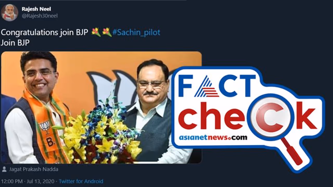 കോണ്ഗ്രസ് നേതാവ് സച്ചിന് പൈലറ്റ് ബിജെപിയില് ചേര്ന്നതായി ചിത്രം സഹിതം നടക്കുന്ന പ്രചാരണം വ്യാജമാണ്