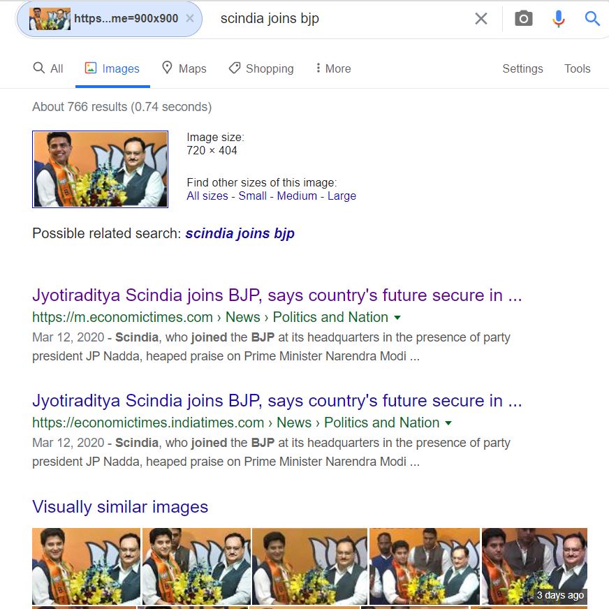 റിവേഴ്സ് ഇമേജ് ഉപയോഗിച്ച് ബൂംലൈവ് നടത്തിയ പരിശോധനയിലാണ് സിന്ധ്യ ബിജെപിയില് ചേര്ന്ന സമയത്തെ ചിത്രവുമായി ഈ ചിത്രത്തിന് സാമ്യമുണ്ടെന്ന് കണ്ടെത്തിയത്. 2020 മാര്ച്ച് 12ലെ ചിത്രമായിരുന്നു സിന്ധ്യയുടേത്.