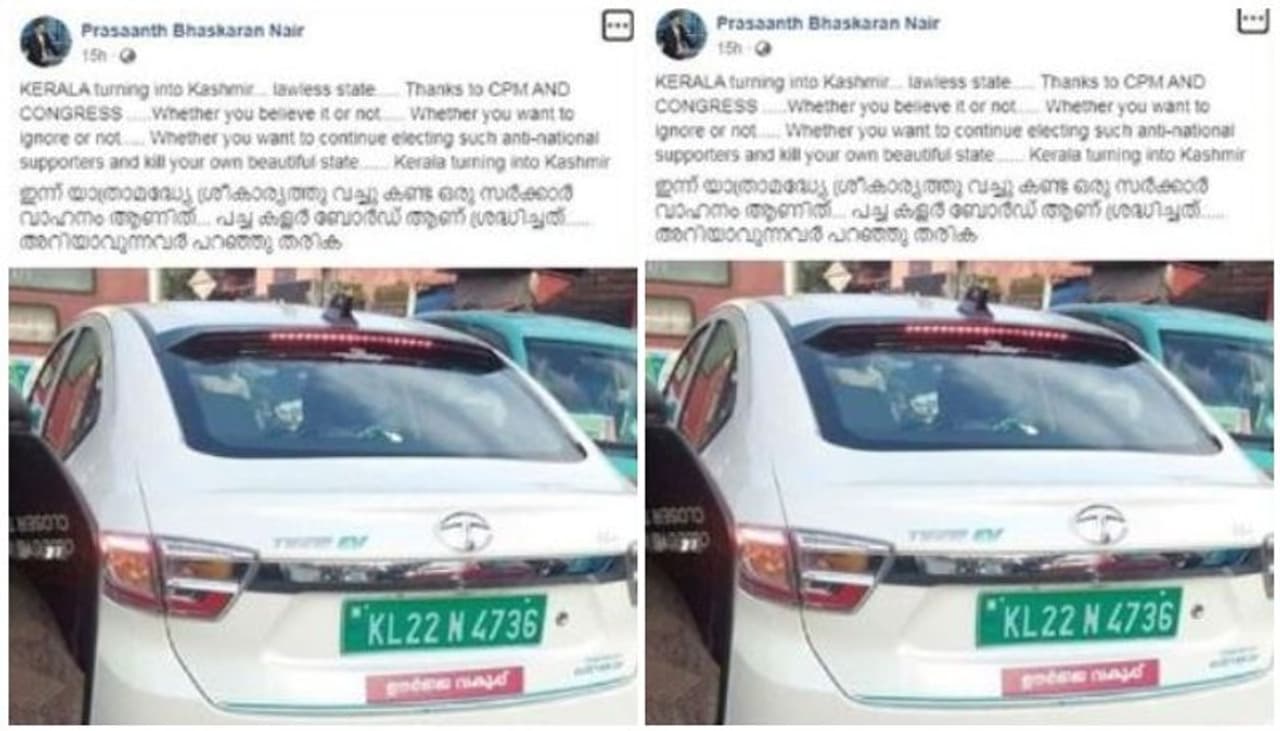 പച്ച നിറത്തിൽ രജിസ്ട്രേഷൻ ബോർഡ് വച്ച സർക്കാർ വാഹനത്തിന്റെ ചിത്രത്തോടെയുള്ള ഫേസ്ബുക് പോസ്റ്റ് ഇടുകയും, അതോടൊപ്പം ജനങ്ങൾക്കിടയിൽ മതപരവും രാഷ്ട്രീയവുമായ വിദ്വേഷവും ഉണ്ടാക്കുന്ന സന്ദേശവും നൽകിയിട്ടുണ്ടെന്ന് പിആര്ഡിയുടെ വസ്തുതാ പരിശോധക വിഭാഗം കണ്ടെത്തിയിട്ടുണ്ട്. നിലവിൽ രാജ്യത്ത് ഇലക്ട്രിക്ക് വാഹനങ്ങളിൽ രജിസ്ട്രേഷൻ നമ്പർ പ്രദർശിപ്പിക്കാൻ നിർദ്ദേശിച്ചിട്ടുള്ള പശ്ചാത്തല നിറം പച്ചയാണ് എന്ന് പിആര്ഡി വ്യക്തമാക്കുന്നു.