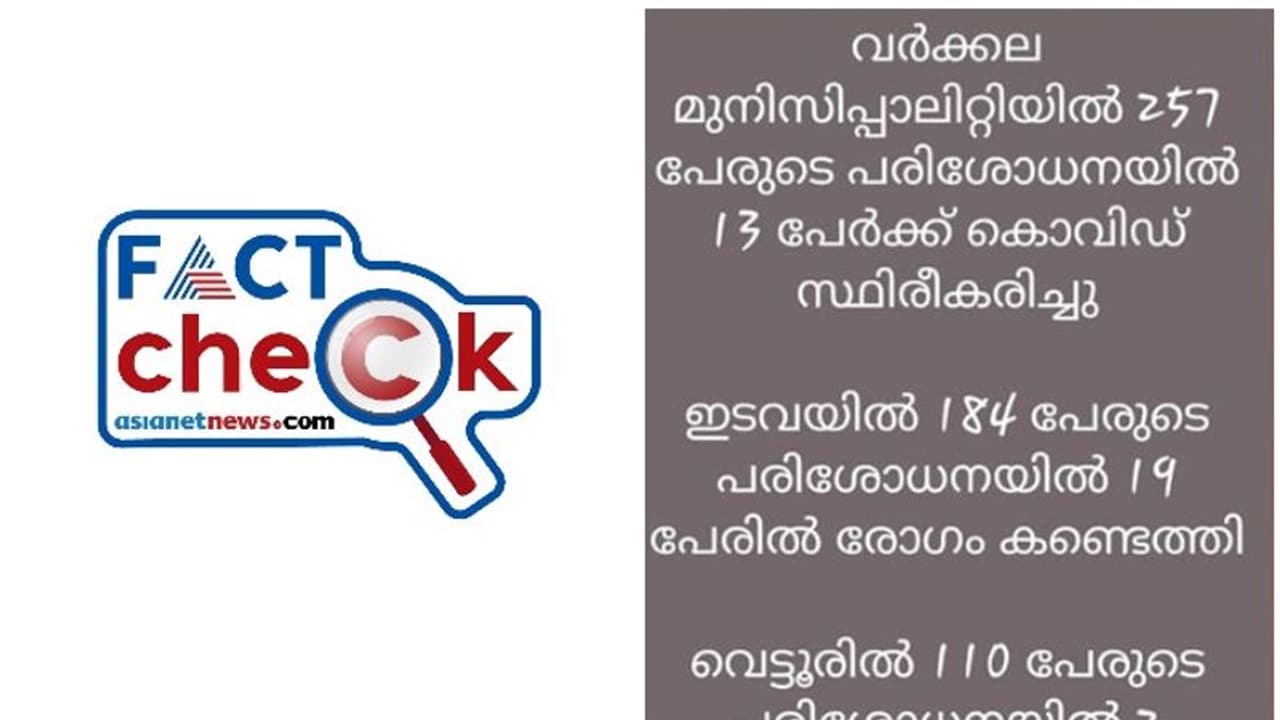 'വര്ക്കല മുന്സിപ്പാലിറ്റിയില് 257 പേര്ക്ക് നടത്തിയ പരിശോധനയില് 13 പേര്ക്ക് കൊവിഡ് 19 സ്ഥിരീകരിച്ചു. ഇടവയില് 184 പേരുടെ പരിശോധനയില് 19 പേരില് കൊവിഡ് സ്ഥിരീകരിച്ചു. വെട്ടൂരില് 110 പേരുടെ പരിശോധനയില് 2 പേര്ക്ക് രോഗം സ്ഥിരീകരിച്ചു' എന്നാണ് സമൂഹമാധ്യമങ്ങളില് വ്യാപകമാവുന്ന പ്രചാരണം. വാട്ട്സ്ആപ്പ്, ഫേസ്ബുക്ക് അടക്കമുള്ള മാധ്യമങ്ങളില് ഈ കുറിപ്പ് വ്യാപകമായി പ്രചരിച്ചു. സംസ്ഥാനത്ത് കൊവിഡ് 19 വ്യാപകമാവുന്നതിന് ഇടയില് നടന്ന പ്രചാരണം നിരവധിപ്പേരെയാണ് ആശങ്കയിലാക്കിയത്.