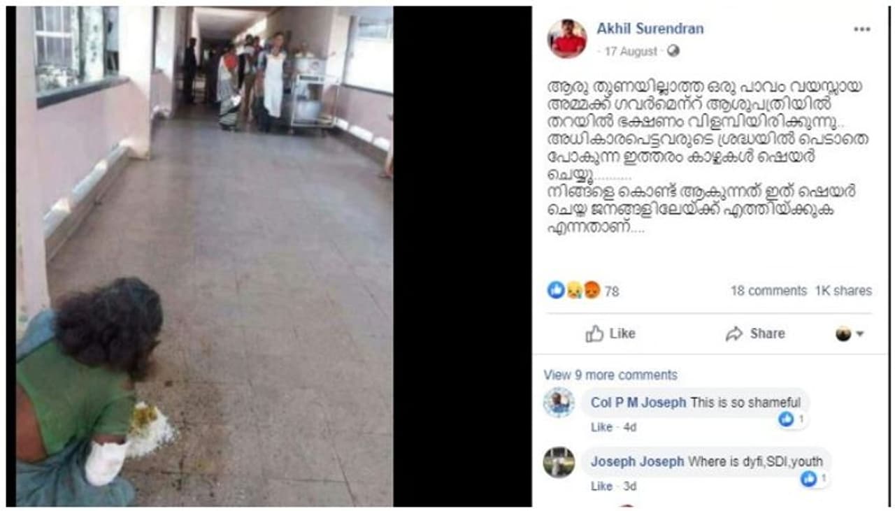 മലയാളത്തിലുള്ള കുറിപ്പിനൊപ്പം ഒരു വൃദ്ധ ആശുപത്രിയിലെ വരാന്തയിലെ തറയിലിരുന്ന് ചോറുണ്ണുന്ന ചിത്രത്തിന്റെ വസ്തുതയെന്താണ്?