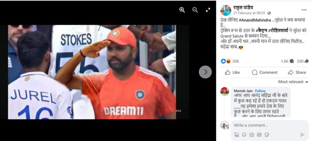 ധ്രുവ് ജൂറെലിനെ ഇന്ത്യന് ക്രിക്കറ്റ് ടീം ക്യാപ്റ്റന് രോഹിത് ശർമ്മ സല്യൂട്ട് ചെയ്യുന്നതായാണ് ഫോട്ടോ ഫേസ്ബുക്കില് പ്രചരിക്കുന്നത്