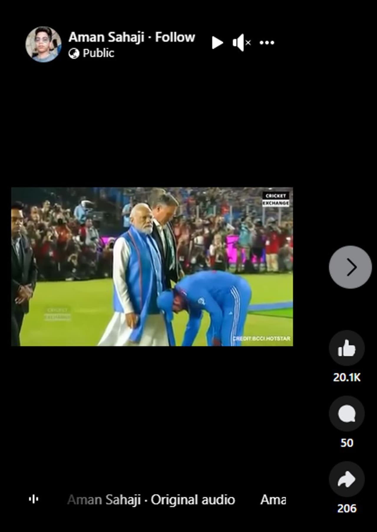 അഹമ്മദാബാദിലെ നരേന്ദ്ര മോദി സ്റ്റേഡിയത്തിലെ സമ്മാനവിതരണ വേദിയിലേക്ക് പ്രധാനമന്ത്രി പോകുമ്പോള് ഇന്ത്യന് ക്രിക്കറ്റ് ടീം ക്യാപ്റ്റന് രോഹിത് ശര്മ്മ അദേഹത്തിന്റെ കാലുകളില് തൊട്ട് വന്ദിച്ചതായാണ് ചിത്രം സോഷ്യല് മീഡിയയില് പ്രചരിക്കുന്നത്. ഈ ഫോട്ടോ സഹിതമുള്ള ഒരു റീല്സ് ചുവടെ കാണാം.