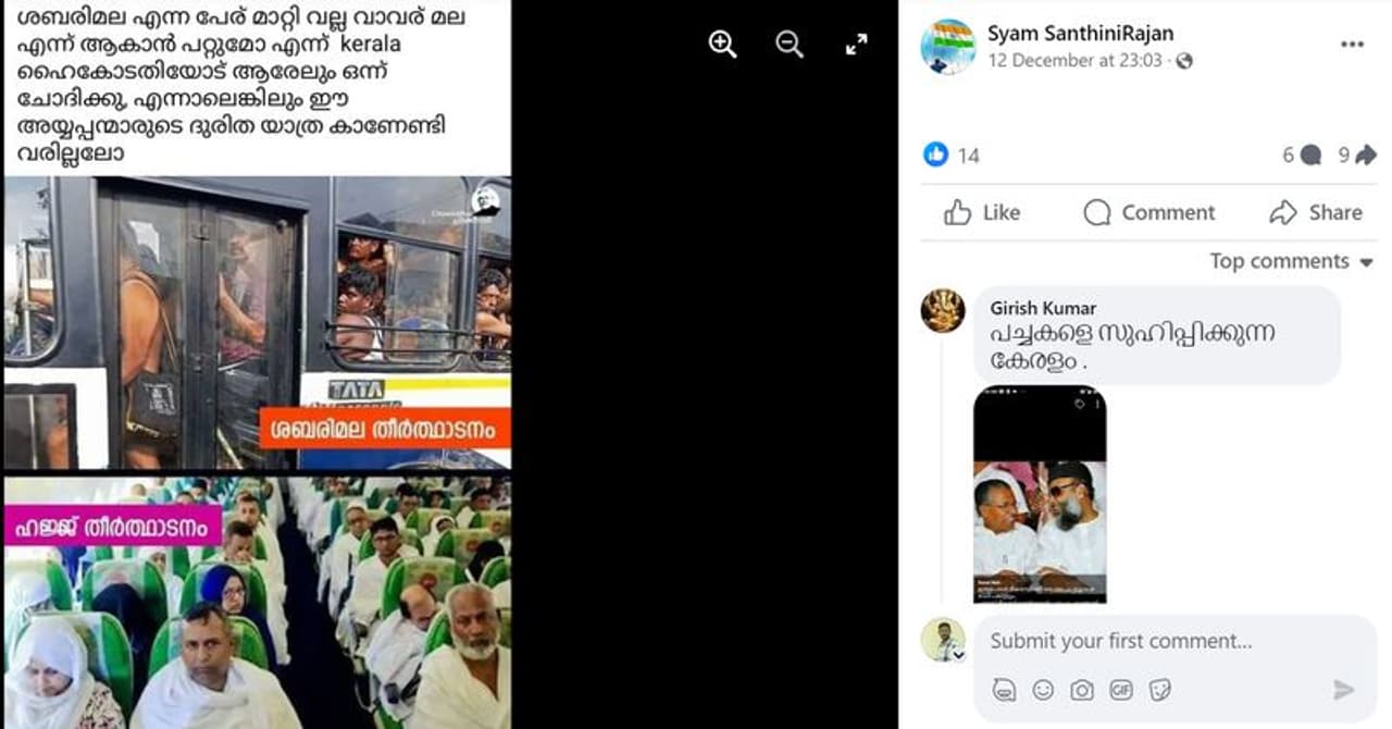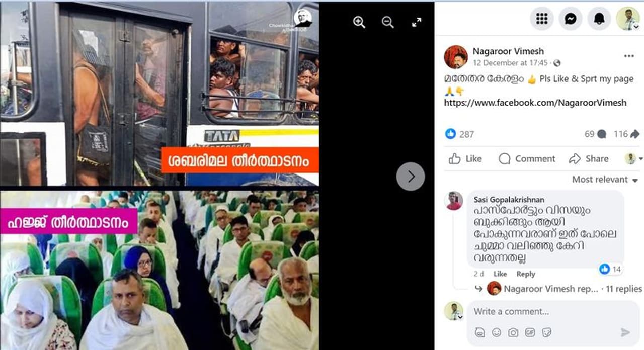 'മതേതര കേരളം 👍 Pls Like & Sprt my page 🙏👇' എന്ന തലക്കെട്ടോടെ നാഗാവൂർ വിമേഷ് എന്നയാളുടെ ഫേസ്ബുക്ക് പേജില് വന്ന ചിത്രം ഇങ്ങനെ. രണ്ട് ഫോട്ടോകളുള്ള കൊളാഷാണ് വിമേഷ് എഫ്ബിയില് പങ്കുവെച്ചിരിക്കുന്നത്. 'ശബരിമല തീർഥാടനം' എന്ന അടിക്കുറിപ്പോടെയുള്ള ആദ്യ ഫോട്ടോയില് കാണുന്നത് ബസില് തിങ്ങിനിറഞ്ഞ് അയ്യപ്പഭക്തന്മാർ യാത്ര ചെയ്യുന്നതാണ്. ഹജ്ജ് കർമ്മം നിർവഹിക്കാന് പോകുന്ന തീർഥാടകർ സീറ്റിംഗ് കപ്പാസിറ്റിക്ക് അനുസരിച്ച് മാത്രം ആളുകളുള്ള വാഹനത്തില് (വിമാനം) പോകുന്നതാണ് രണ്ടാമത്തെ ഫോട്ടോയില്. 'ഹജജ് തീർഥാടനം' എന്നാണ് ഈ ചിത്രത്തിന്റെ അടിക്കുറിപ്പ്.