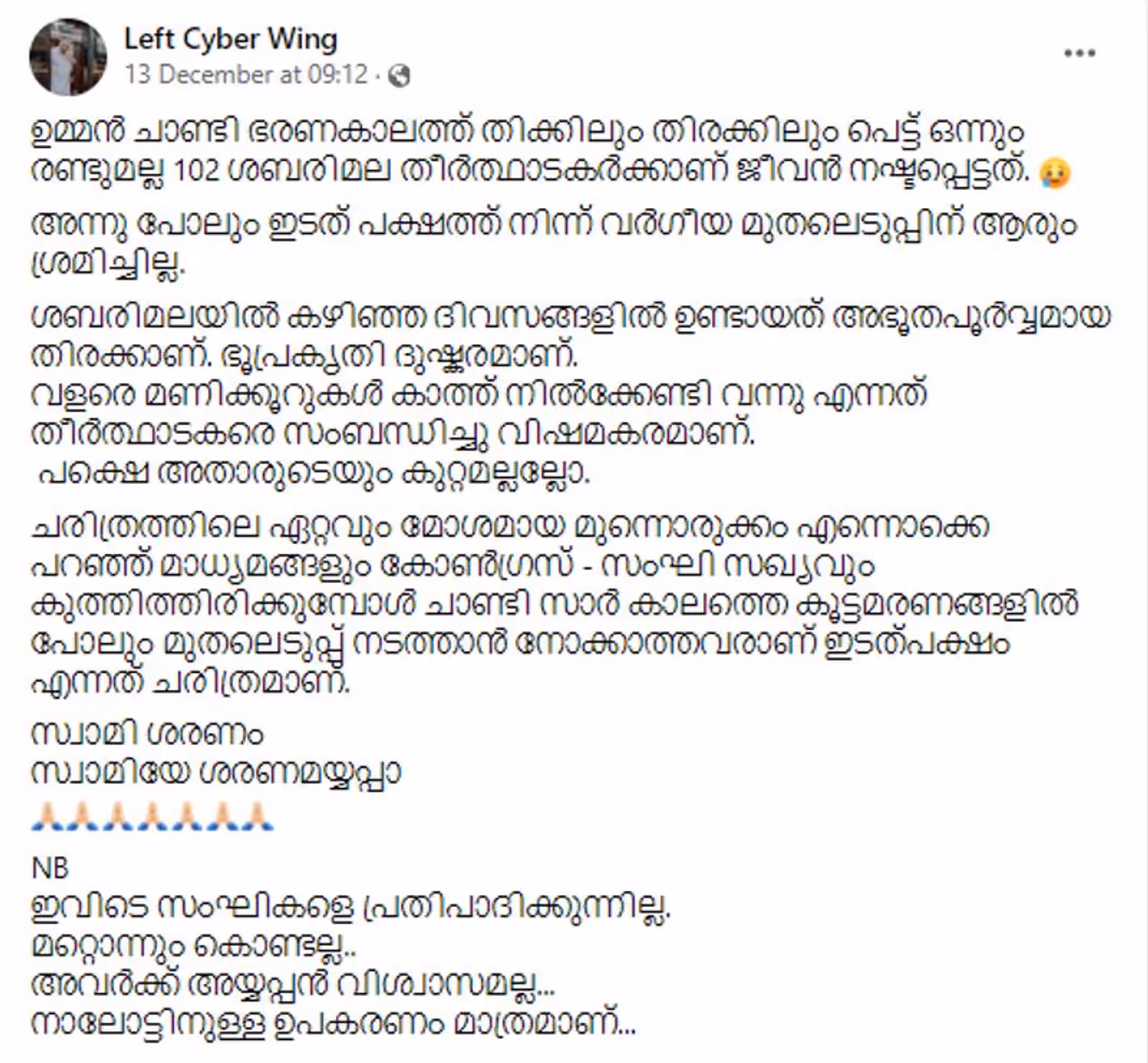 'ഉമ്മൻ ചാണ്ടി ഭരണകാലത്ത് തിക്കിലും തിരക്കിലും പെട്ട് ഒന്നും രണ്ടുമല്ല 102 ശബരിമല തീർത്ഥാടകർക്കാണ് ജീവൻ നഷ്ടപ്പെട്ടത്. 🥲