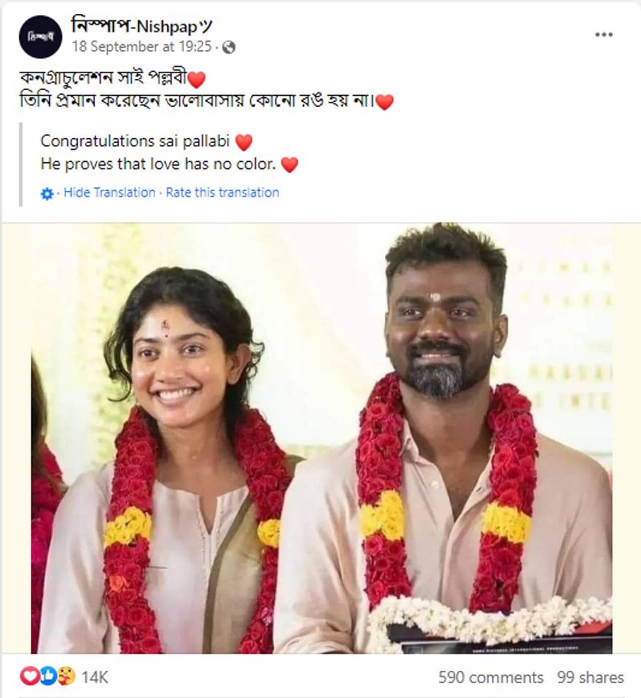 സായ് പല്ലവിക്ക് അഭിനന്ദനങ്ങള്, പ്രണയത്തിന് നിറമില്ല എന്ന് സായ് പല്ലവി തെളിയിച്ചു എന്നുമാണ് ഒരു ചിത്രം സഹിതം ഫേസ്ബുക്കിലും മറ്റും പ്രചരിക്കുന്നത്