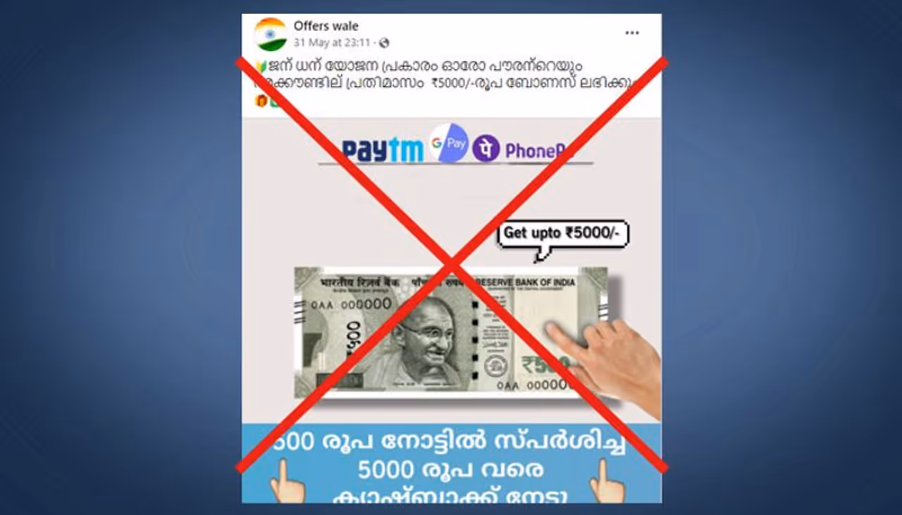 പ്രധാനമന്ത്രി ജന്-ധന് യോജന പ്രകാരം ഓരോ പൗരന്റെയും അക്കൗണ്ടില് പ്രതിമാസം ₹5000/-രൂപ ബോണസ് ലഭിക്കും- എന്നാണ് offers wale എന്ന ഫേസ്ബുക്ക് അക്കൗണ്ടില് 2024 മെയ് 31ന് പ്രത്യക്ഷപ്പെട്ട പോസ്റ്റില് പറയുന്നത്. പേടിഎം, ജിപെ, ഫോണ്പേ എന്നീ ഓണ്ലൈന് പേയ്മെന്റ് സംവിധാനങ്ങളുടെ ലോഗോയുള്ള തംബ്നെയ്ലും ലിങ്കും പോസ്റ്റിനൊപ്പം കാണാം. 500 രൂപ നോട്ടില് സ്പര്ശിച്ച് 5000 രൂപ വരെ ക്യാഷ്ബാക്ക് നേടൂ എന്ന എഴുത്തും തംബ്നെയ്ലില് കാണാം.