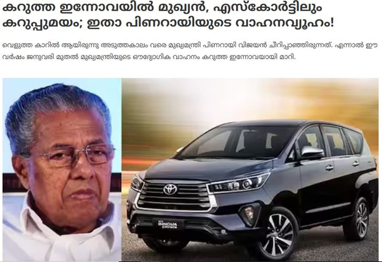 'വിജയൻ വളർത്തുന്ന പേപ്പട്ടിക്ക് മിന്നലടിച്ച് പരിക്ക്' എന്ന മോശം തലക്കെട്ടോടെയാണ് സൈബര് കോണ്ഗ്രസ് എന്ന ഫേസ്ബുക്ക് പേജില് നിന്ന് 2023 ഡിസംബര് 21ന് ഫോട്ടോ പോസ്റ്റ് ചെയ്തിരിക്കുന്നത്. 'വിഐപി സെക്യൂരിറ്റി കമാന്ഡോ' എന്ന ബോര്ഡ് വെച്ച വെള്ള ഇന്നോവ കാറിന് പിന്നിലായി ഒരു സുരക്ഷാ ഉദ്യോഗസ്ഥന് റോഡില് നിലതെറ്റി വീണുകിടക്കുന്നതും വാഹനത്തിലിരിക്കുന്ന മറ്റൊരു സുരക്ഷാ ഉദ്യോഗസ്ഥന് ഇക്കാര്യം നോക്കുന്നതും ചിത്രത്തില് കാണാം. വിഐപി സെക്യൂരിറ്റി എന്ന് എഴുതിയ മറ്റ് ഇന്നോവ കാറുകളും മുന്നില് വരിനിരയായി പോകുന്നത് കാണാമെന്നതിനാല് ഇത് സംസ്ഥാനത്തെ ഒരു ഔദ്യോഗിക വാഹനവ്യൂഹമാണ് എന്ന് മനസിലാക്കാം. കേരളത്തിന്റെ വാഹന രജിസ്ട്രേഷന് കോഡായ KLലിലാണ് ഈ വൈറ്റ് ഇന്നോവ കാറുകള് രജിസ്റ്റര് ചെയ്തിരിക്കുന്നത്.